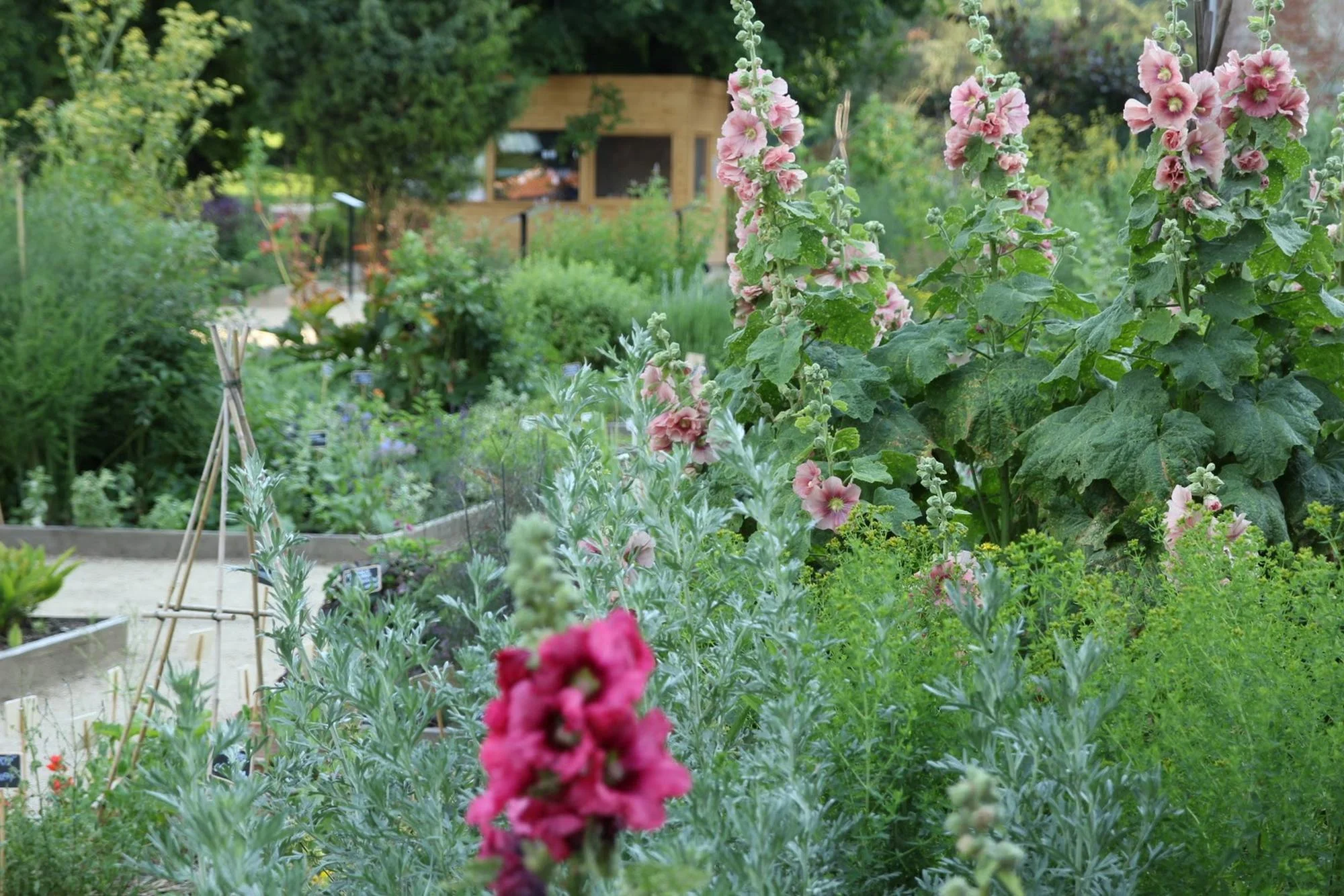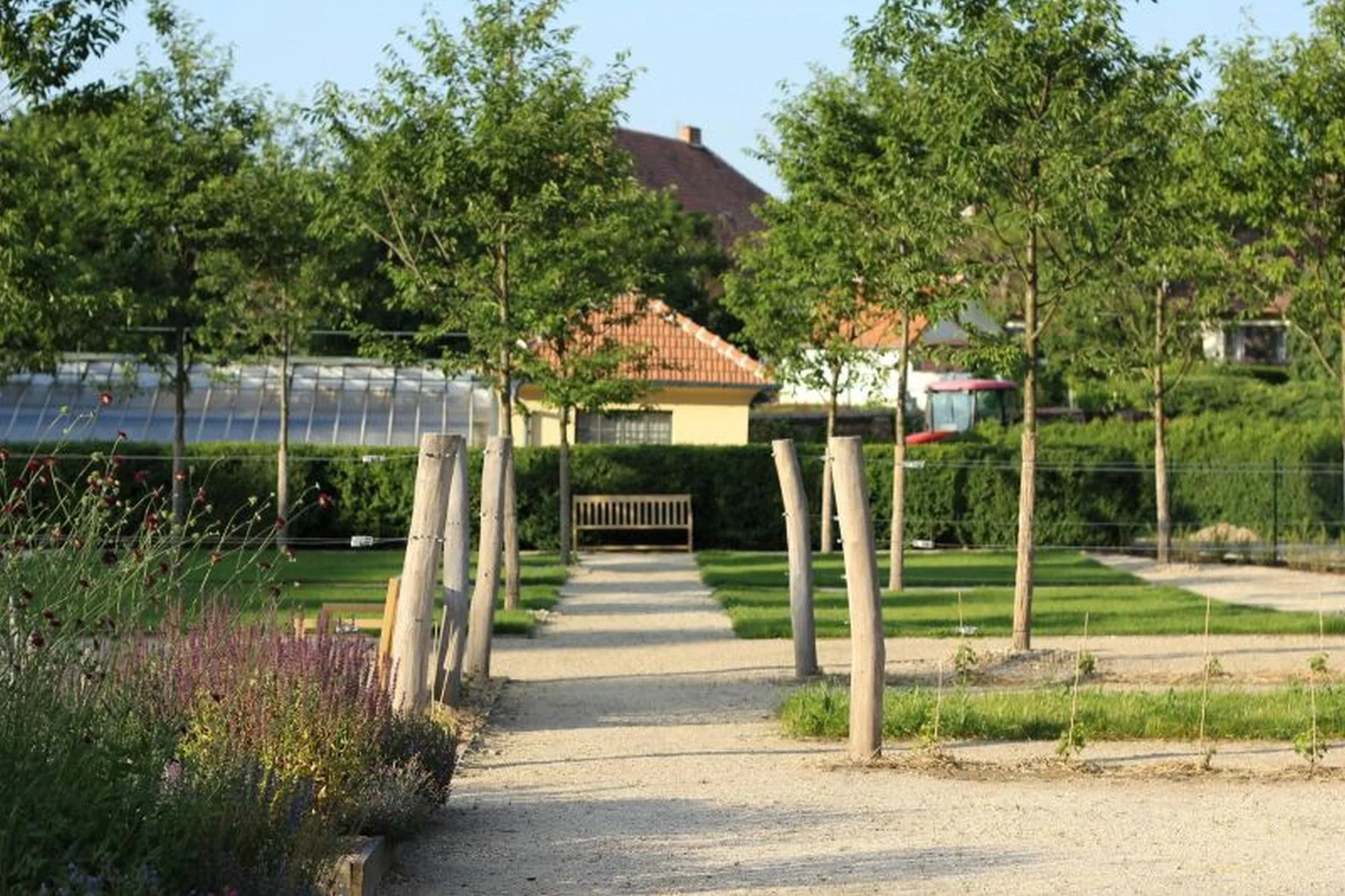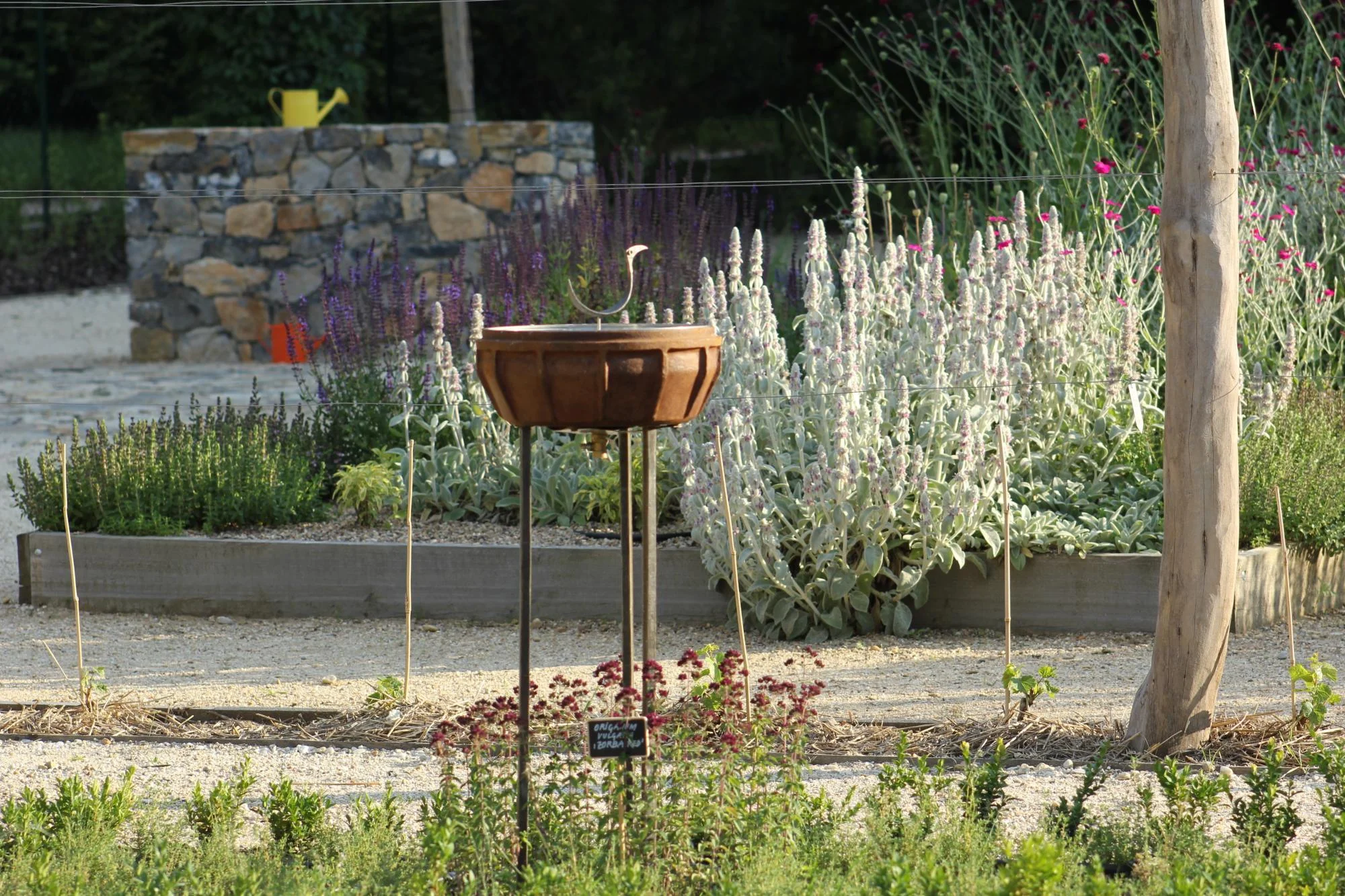 V této zahradě jsme si vyzkoušeli několik originálních prvků a postupů, které byly navrženy speciálně pro tuto zahradu: např. pítko z disku pneumatiky nákladního vozu, informační systém, naši první kůlničku (kiosek) , dubové lavičky.