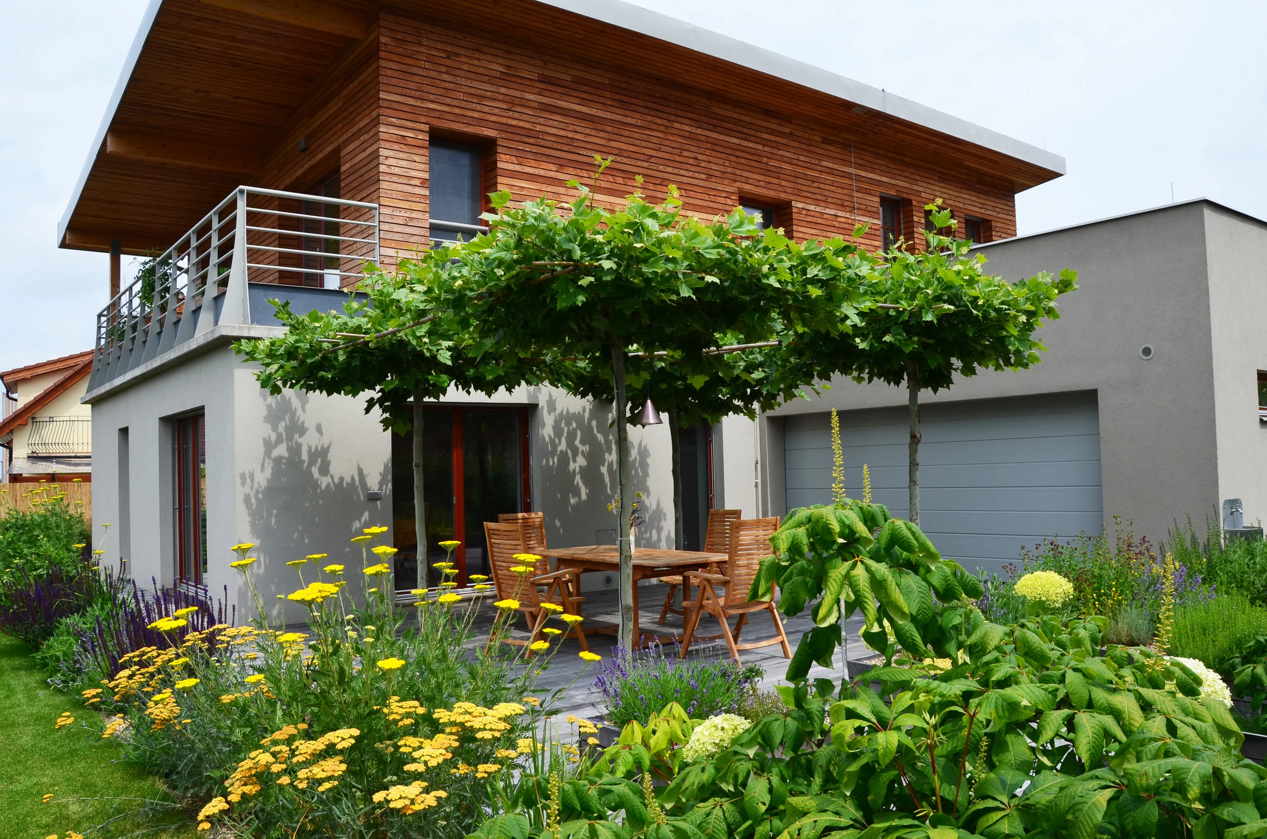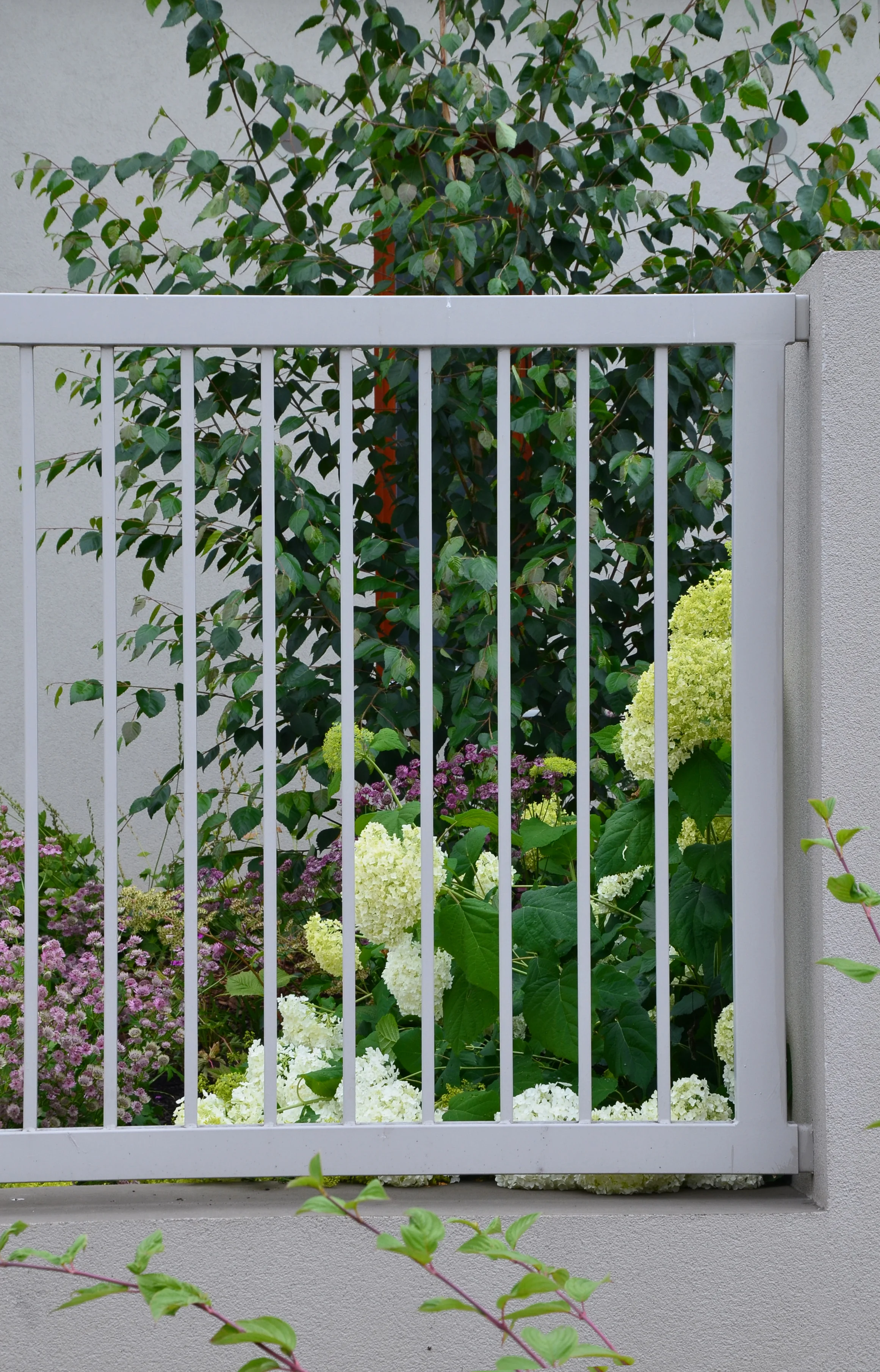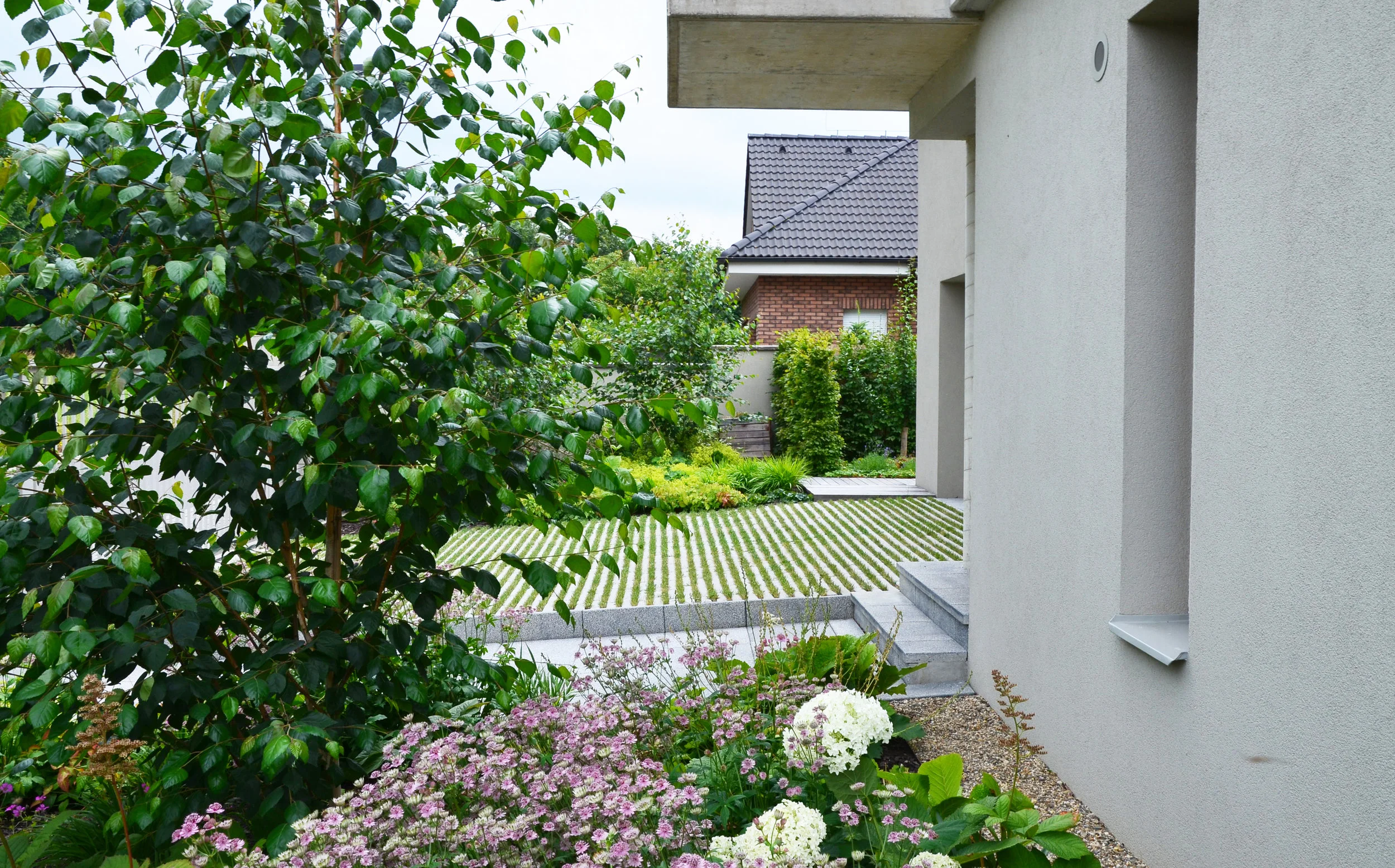 Mezi terasou a živým plotem, který zajišťuje soukromí zbylo místo na hrací trávník. Podél něj je úzký, leč bohatě kvetoucí záhon, který je vnímatelný z oken obývacího pokoje. Lávka mezi ním a domem zajišťuje „suchou nohu“ při vstupu na terasu, zároveň navádí až k maličké zeleninové zahrádce.