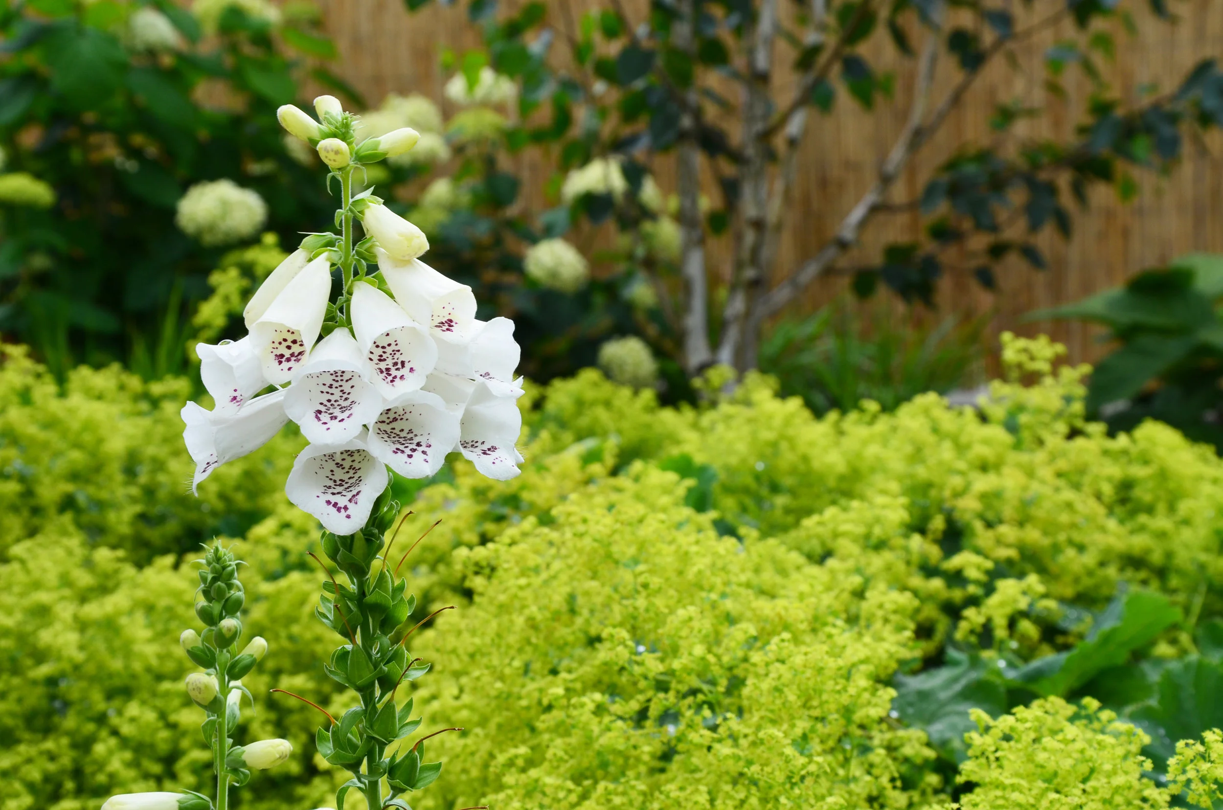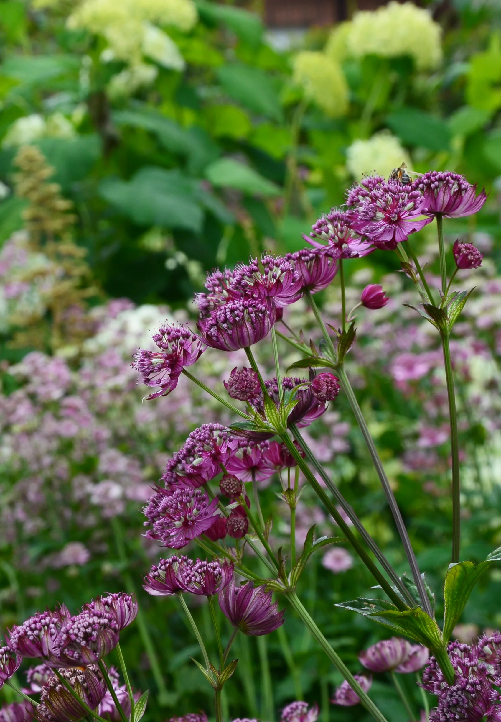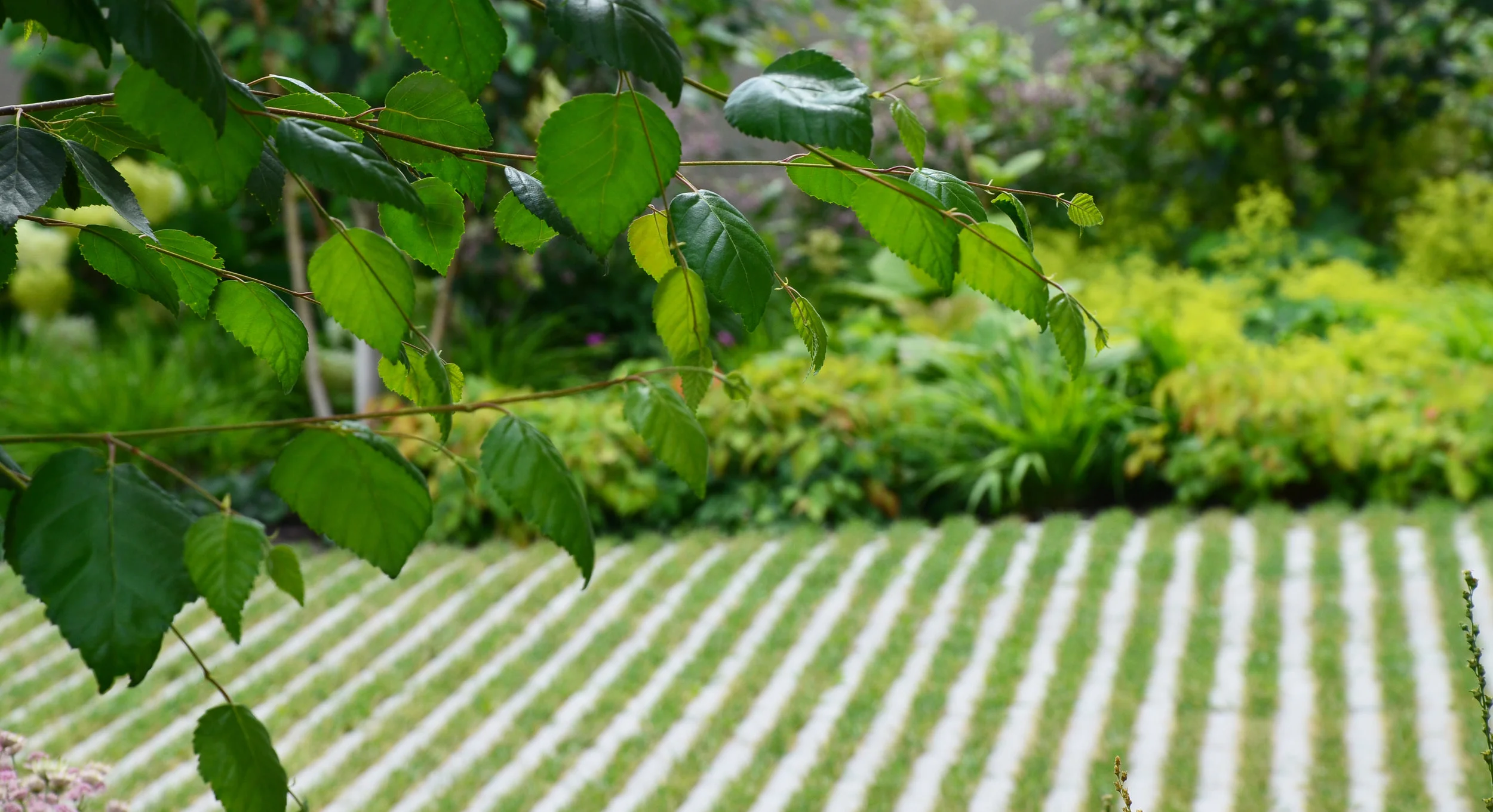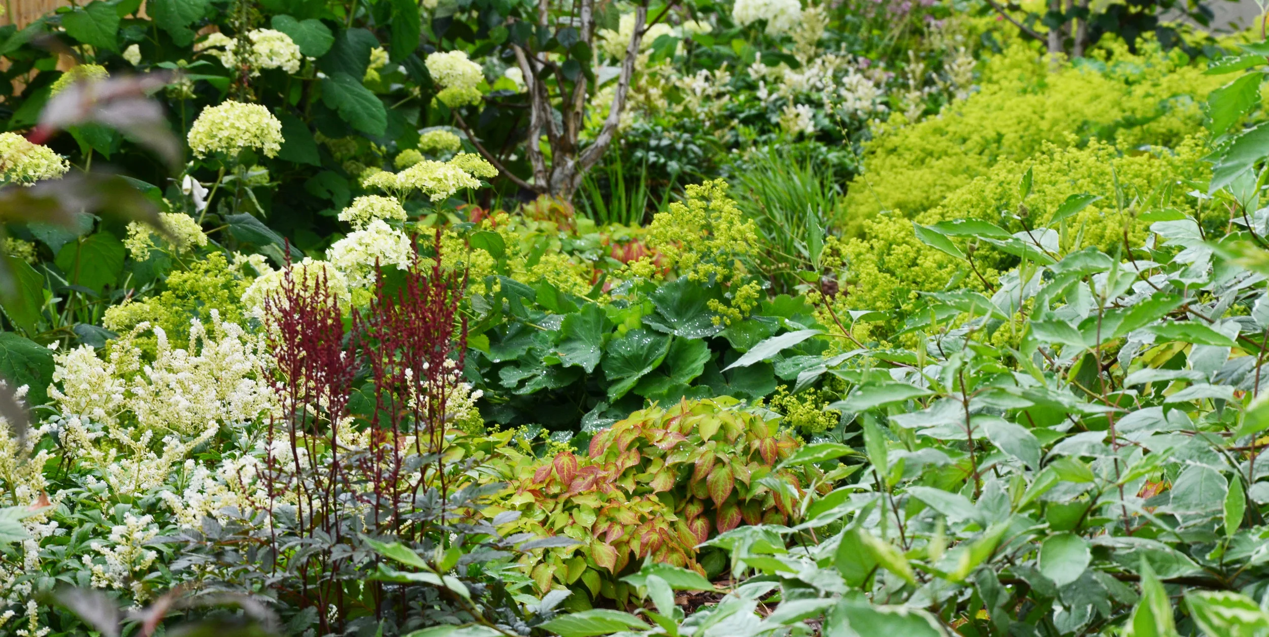 Z této části zahrady se lze díky nenápadné provozní cestičce v trvalkách dostat zpátky do předzahrádky se stromy. Polodivoká, přírodnější výsadba obsahuje hlavně podrostové stinné druhy trvalek a trav, doplněné keři hortenzií a svíd, čímž vytváří kontrast k přísně organizované pobytové části.