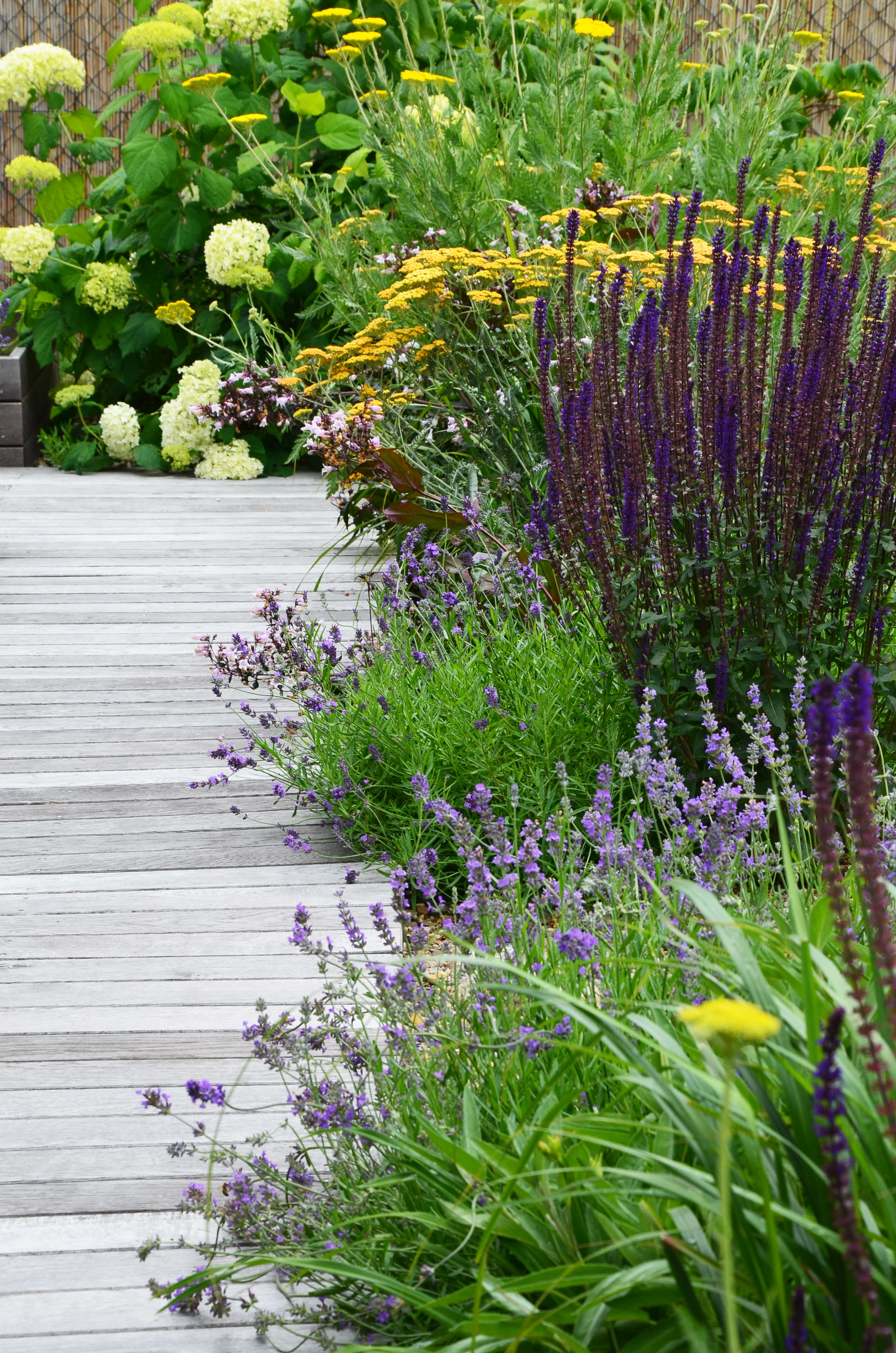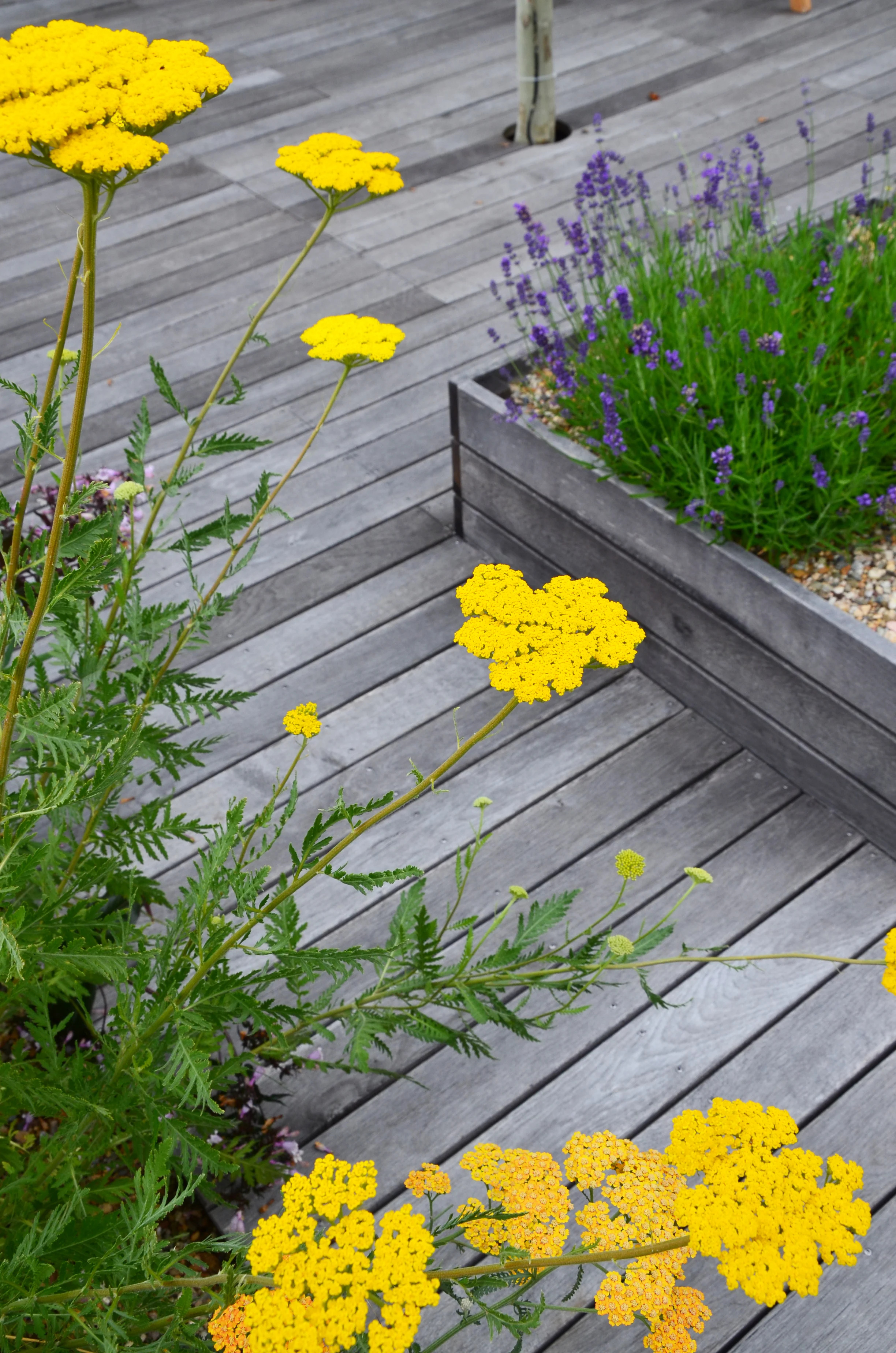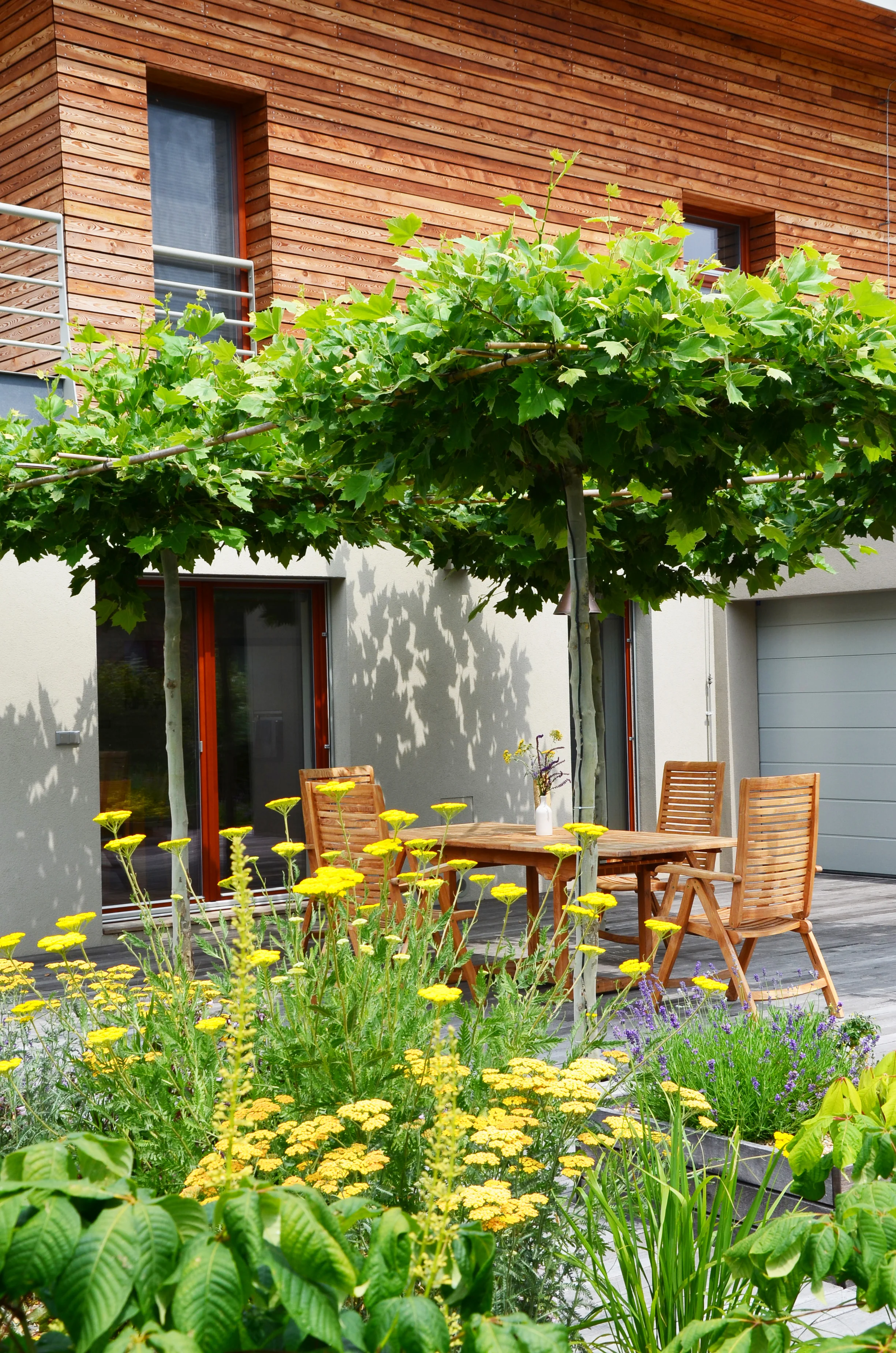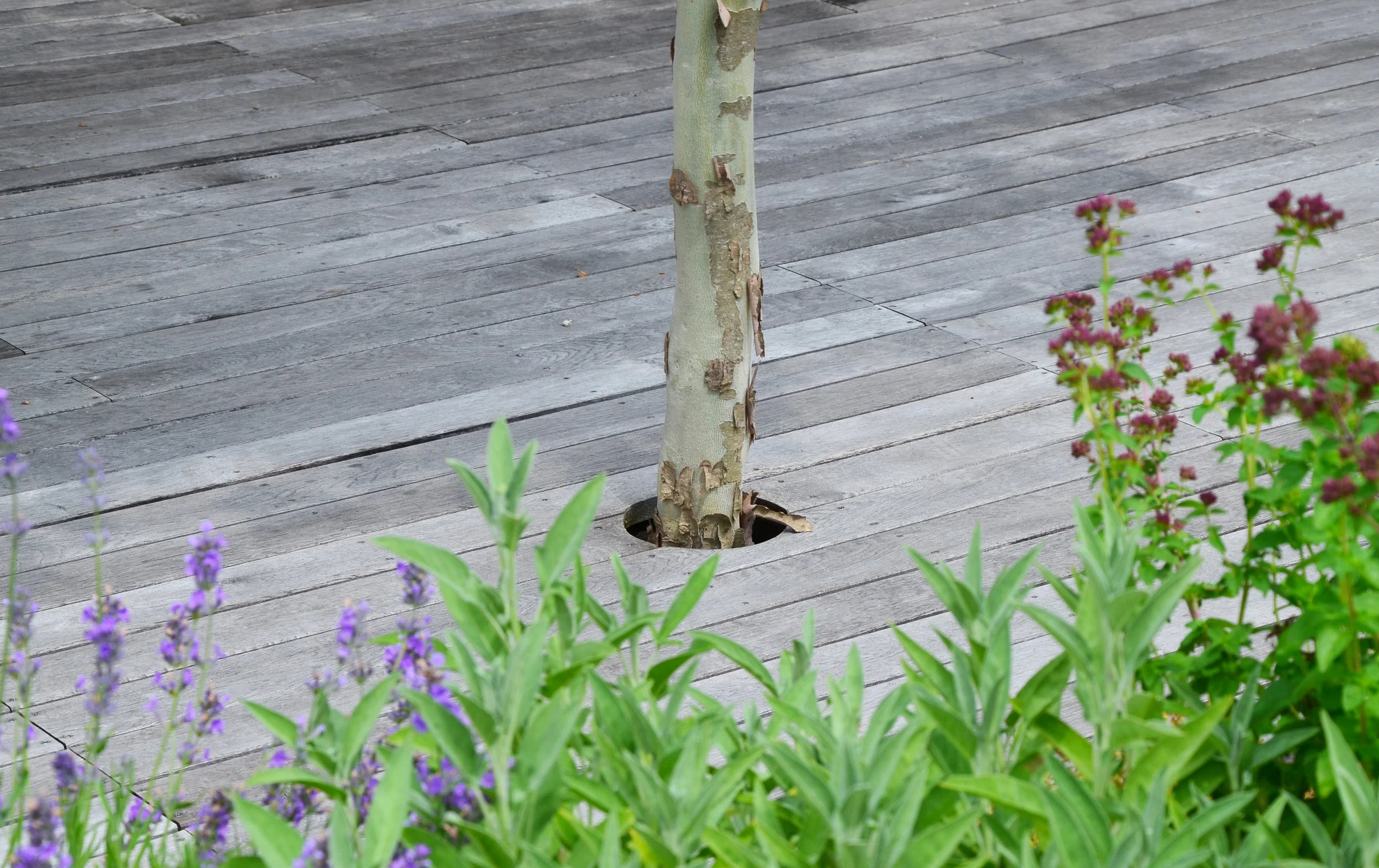 Dřevěná paluba je dosti velkorysých rozměrů, neboť je v ní zabudována zelená pergola z platanů. Samotné sezení obklopují vyvýšené záhony plné vonných bylin. Platany jsou ještě mladé, ale časem srostou a vytvoří zelený slunečník.