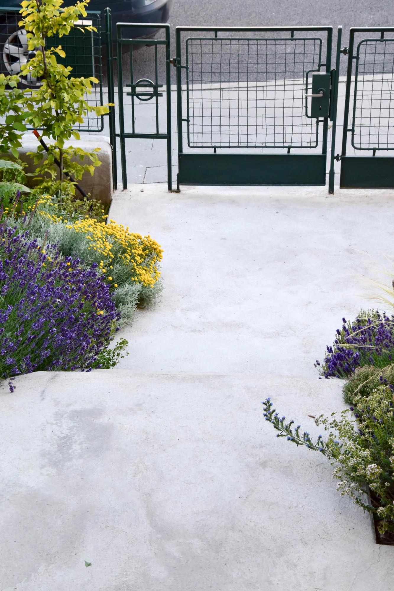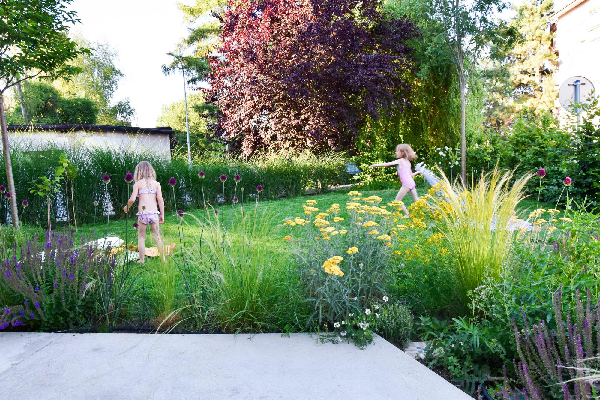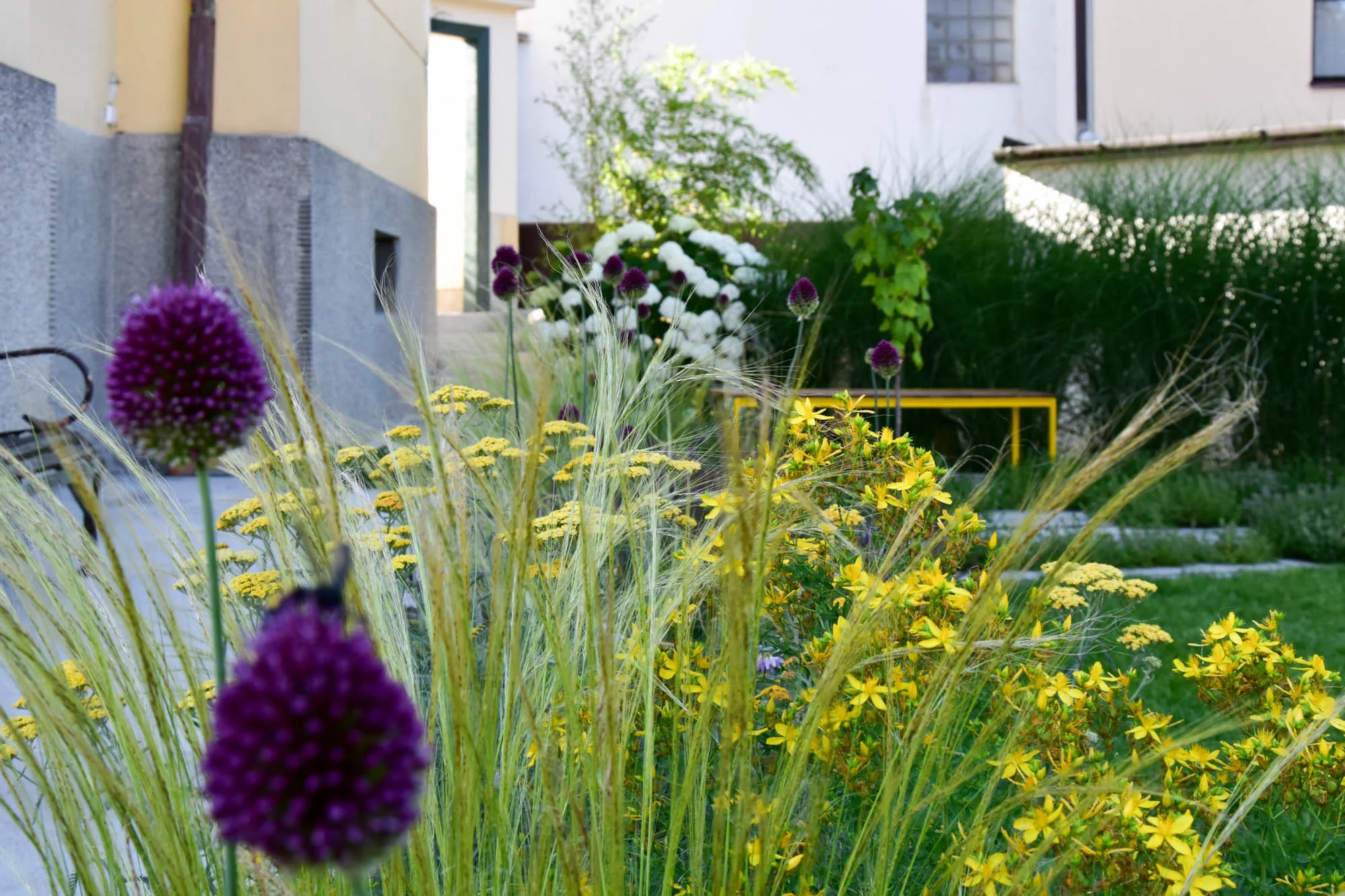 Gletované cestičky jsou hlaďounké a krásně kontrastují s veselými záhony kolem. V těch voní levandule a stébla trav se elegantně pohupují společně s hlavičkami okrasných česneků. V rámci obvodových záhonků je vysazena i bylinková část, ke které vede skrytá pěšinka, opět, z původních dlaždic.