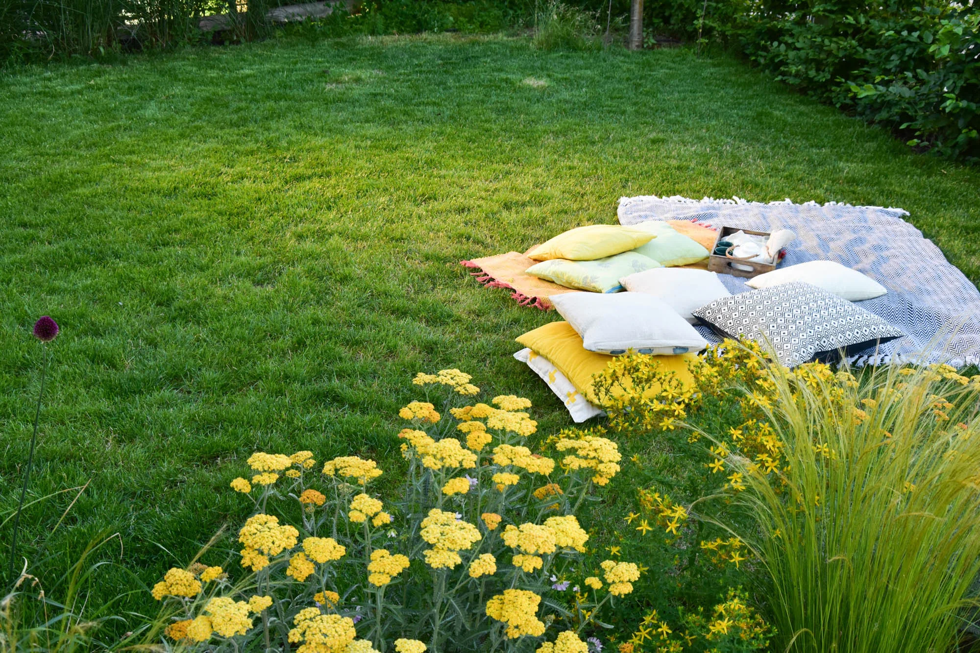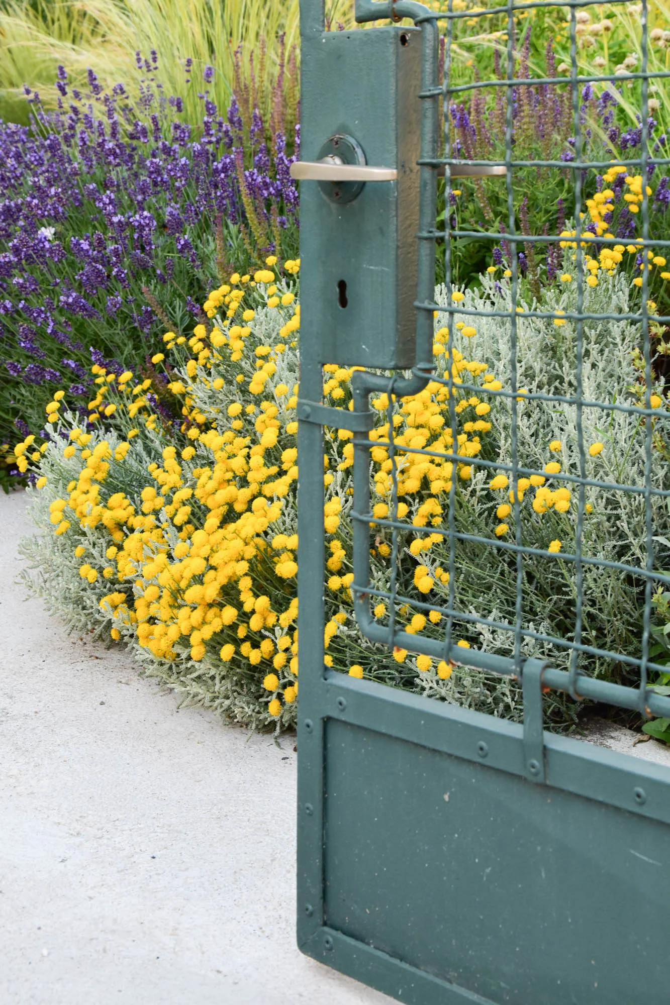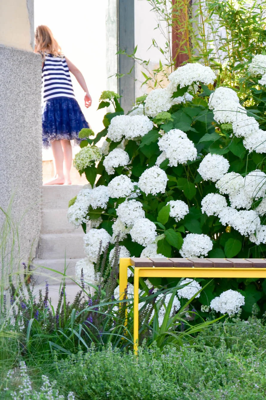 Gletované cestičky jsou hlaďounké a krásně kontrastují s veselými záhony kolem. V těch voní levandule a stébla trav se elegantně pohupují společně s hlavičkami okrasných česneků. V rámci obvodových záhonků je vysazena i bylinková část, ke které vede skrytá pěšinka, opět, z původních dlaždic.