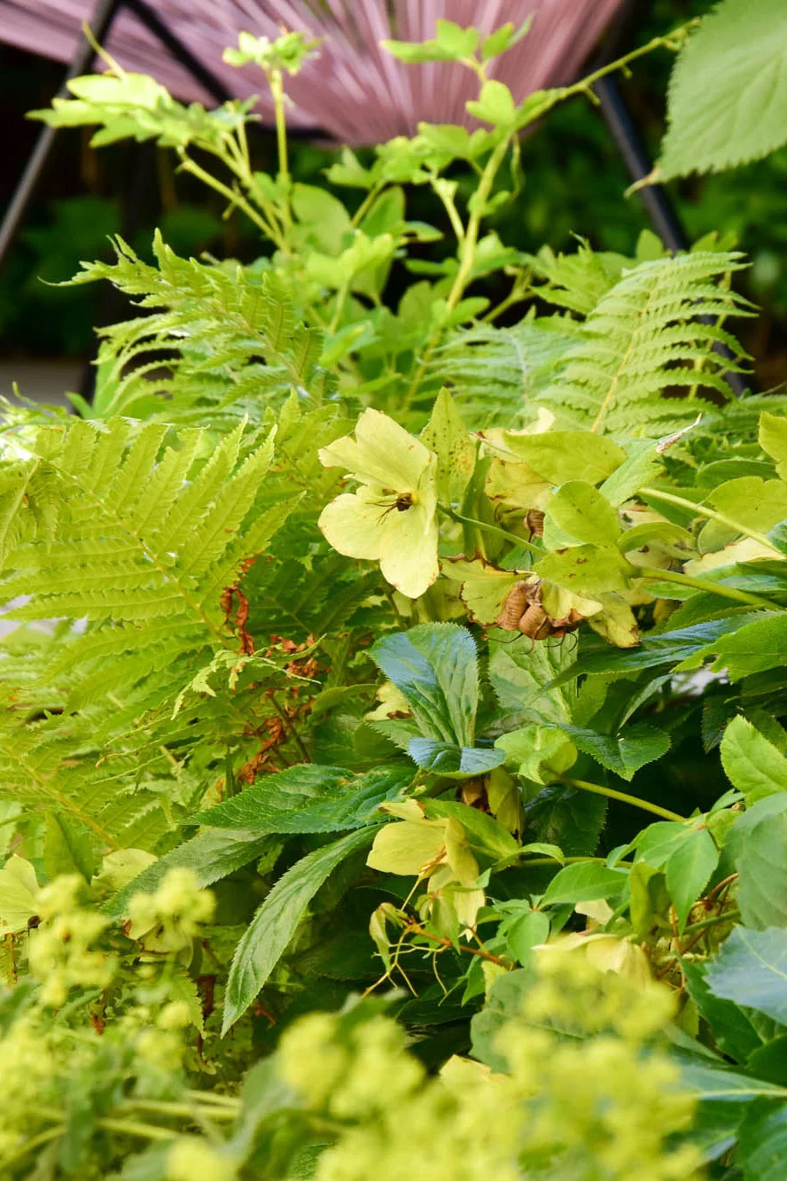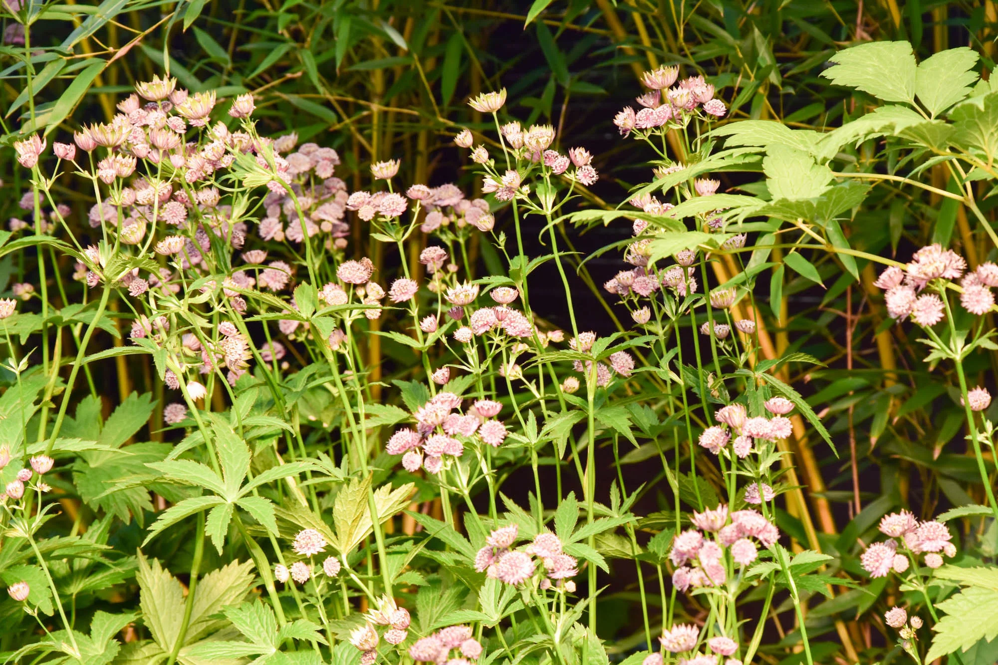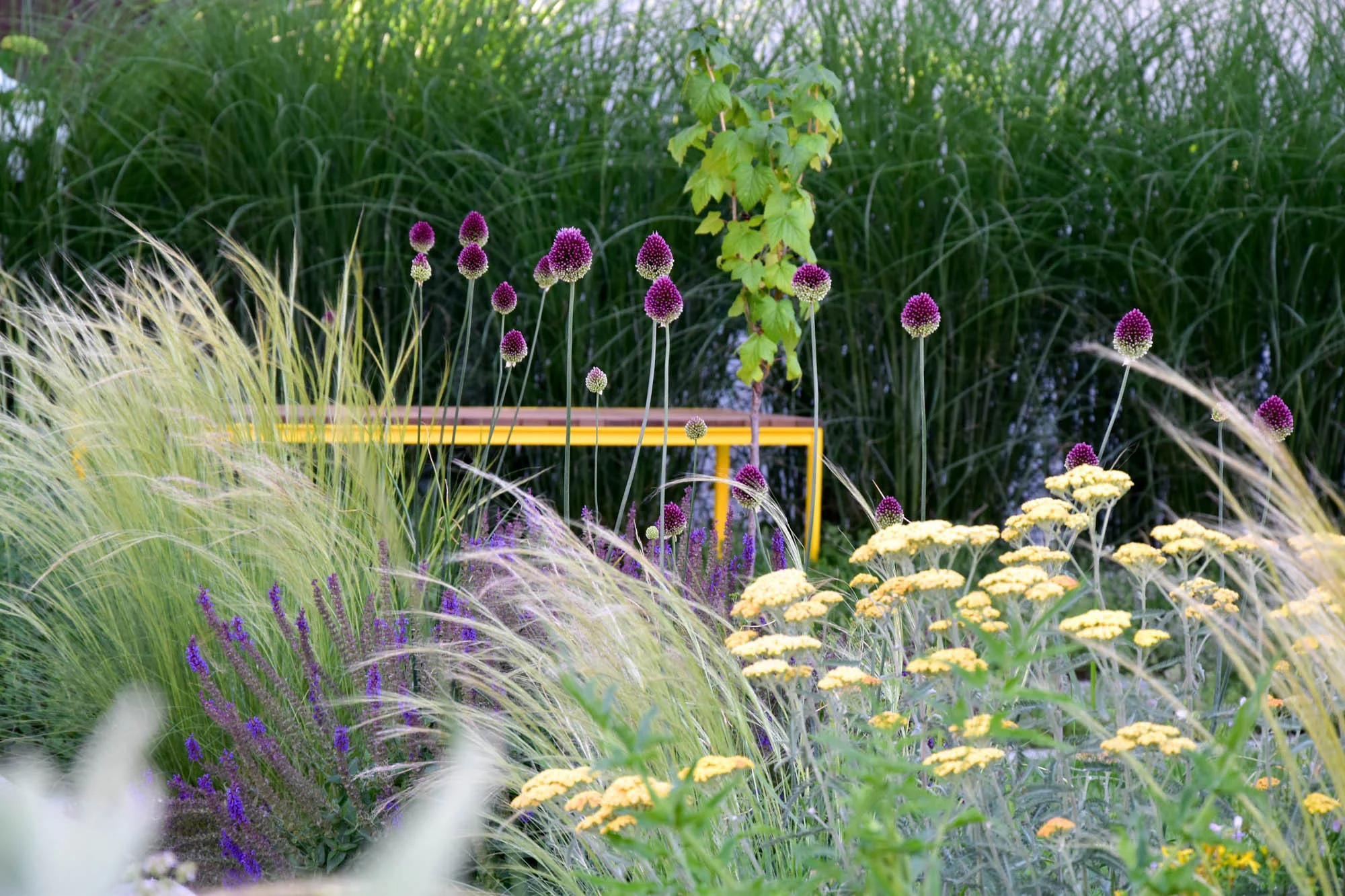 Divoká směs bambusů, trvalek a kroucený kmen původního javoru dotváří pohledovou bariéru v protějším cípu atria i v zimních měsících je zde díky bambusům zeleno.