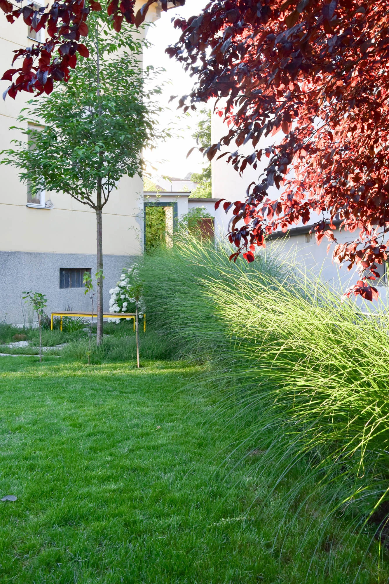 Roh je zakončen výsadbou sloupovitého jeřábu, který vykrývá pohledy z bytových domů, které stojí naproti přes ulici