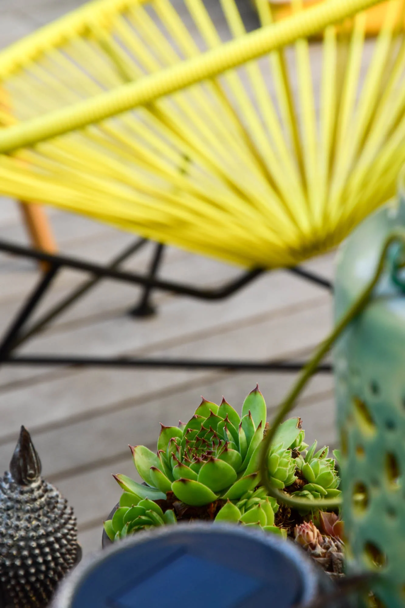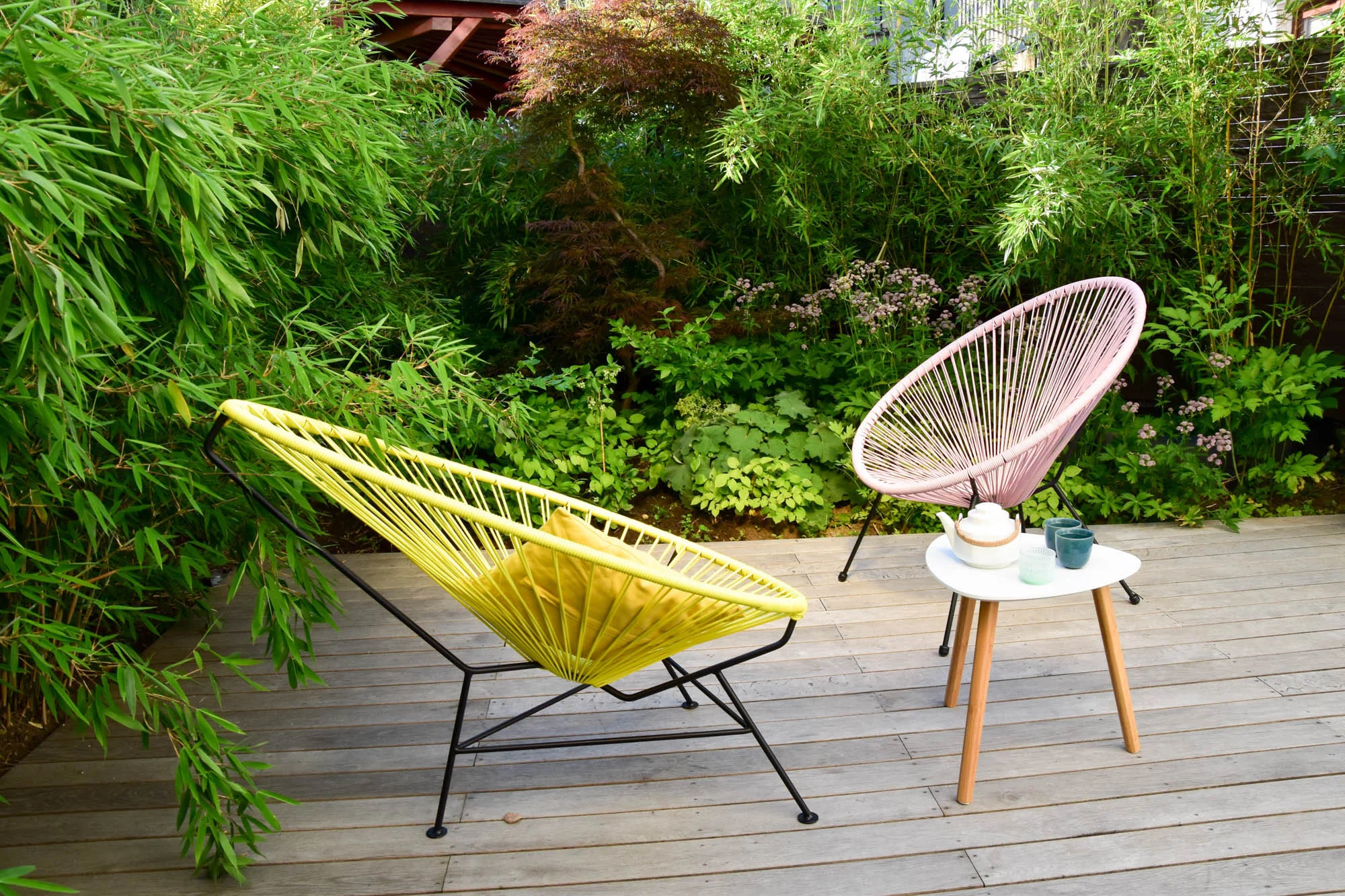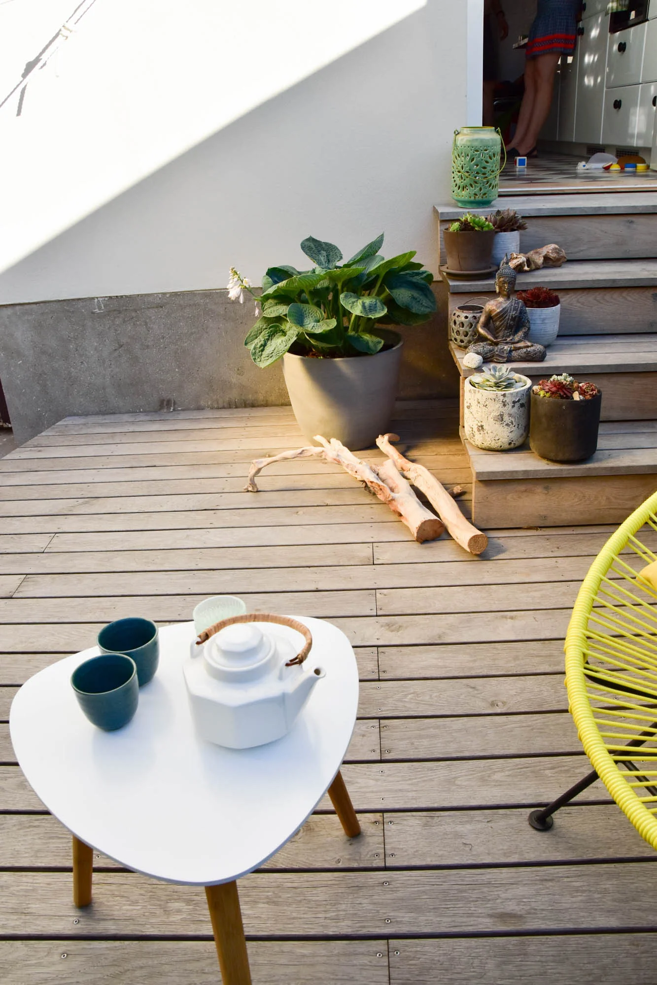Je blízko ke kuchyni, takže čaj a káva se servíruje často právě tady. K sezení slouží nepravidelná dubová paluba, která je zakončena pohledovou výsadbou. Na ni navazuje dřevěné schodiště, kterým lze vystoupat do kuchyňských dveří.
