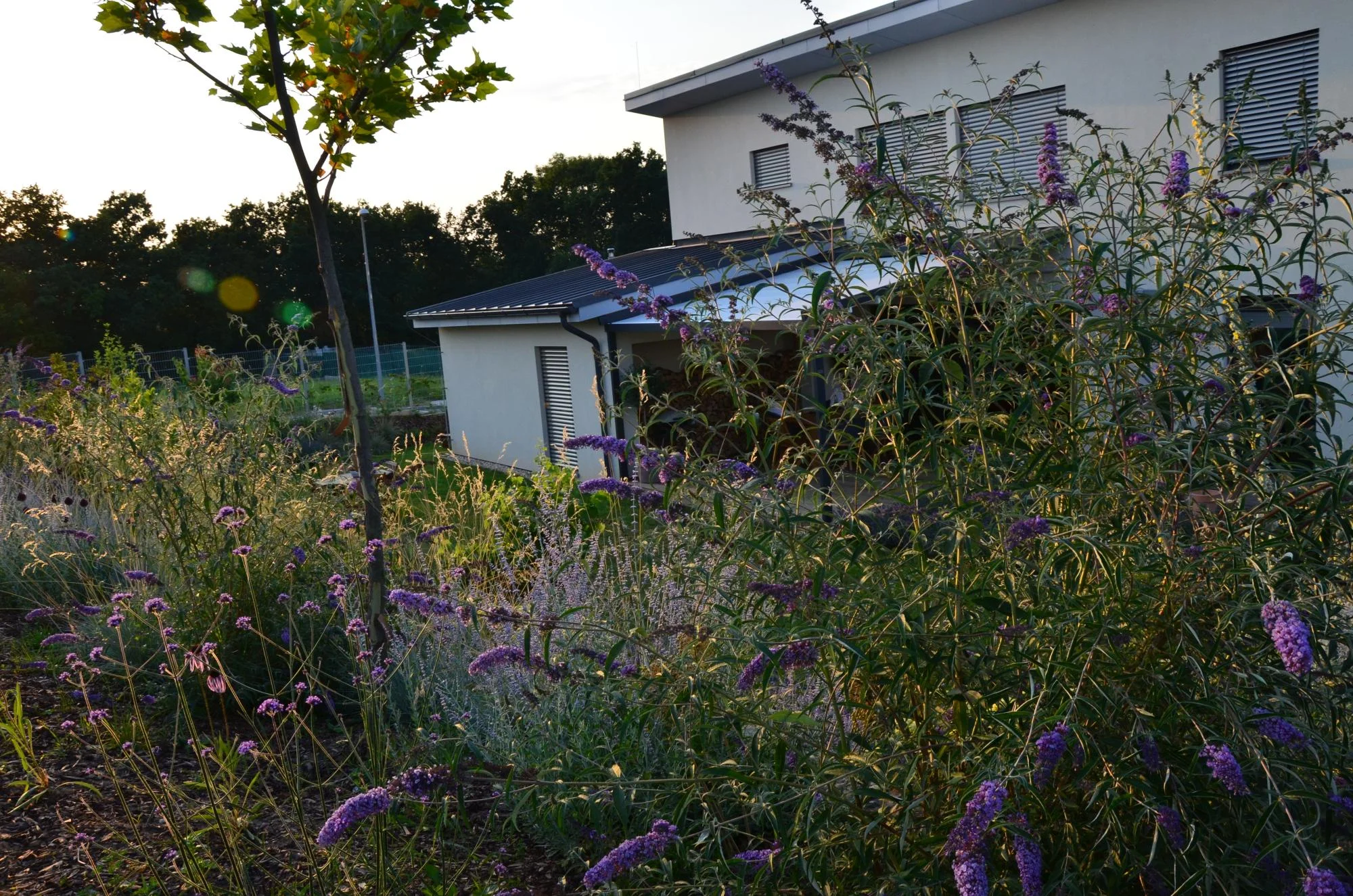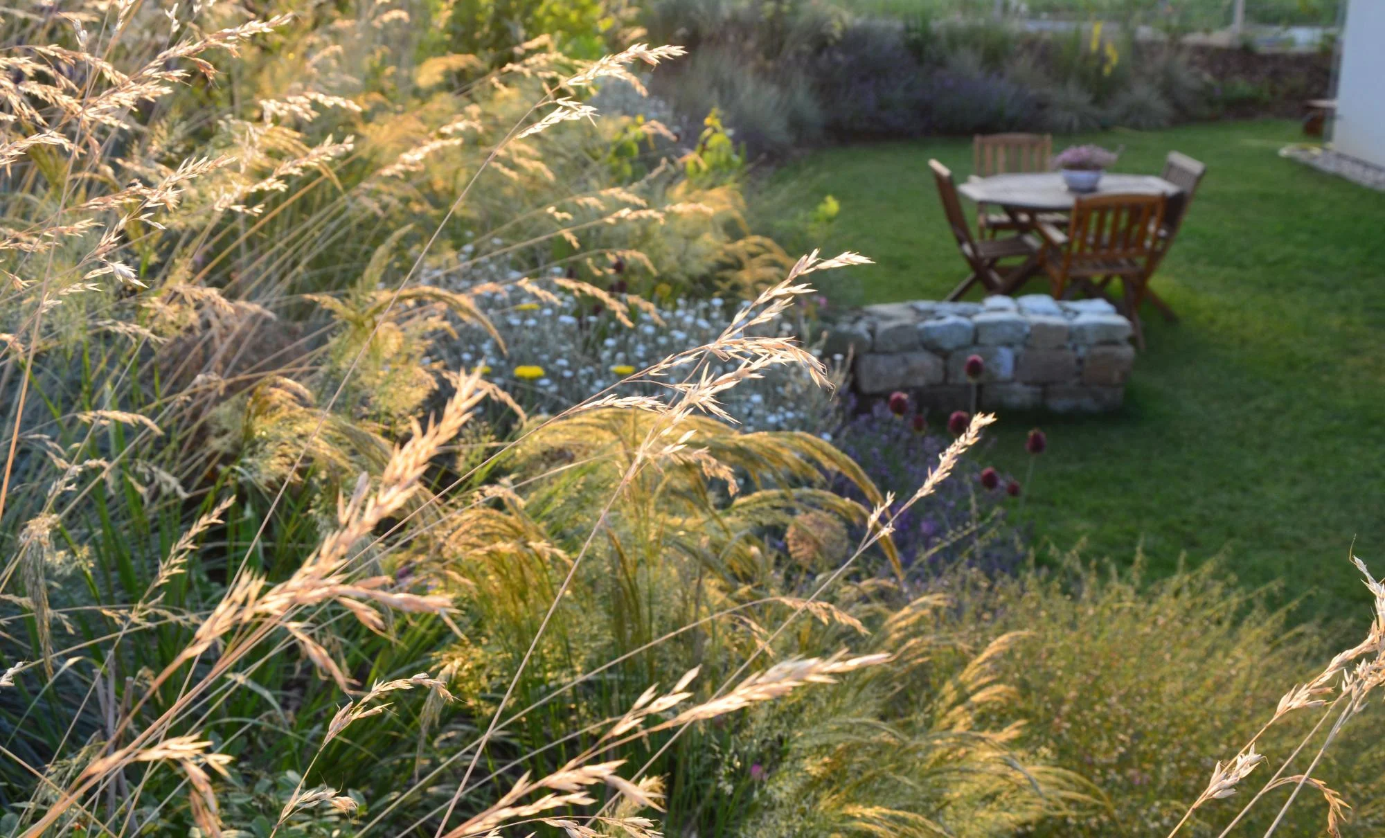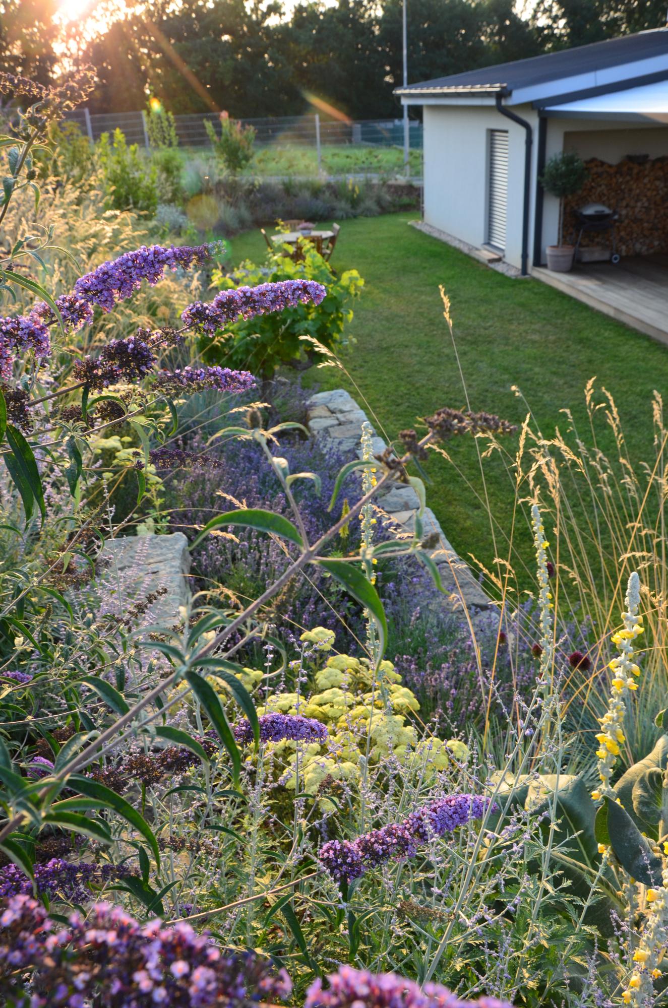 Zkrátka to, co na jižních zemích všichni tolik milujeme. S radostí jsme se nechali unést na jižní vlně a zahradu zaplnili modrou v mnoha odstínech: kvetou zde omamně vonné levandule, perovskie, letní česneky, modré lny, lupiny a komule. Vše doplňuje pohyb lehkých travin, které vlají ve větru a vyvolávají dojem pohybu.