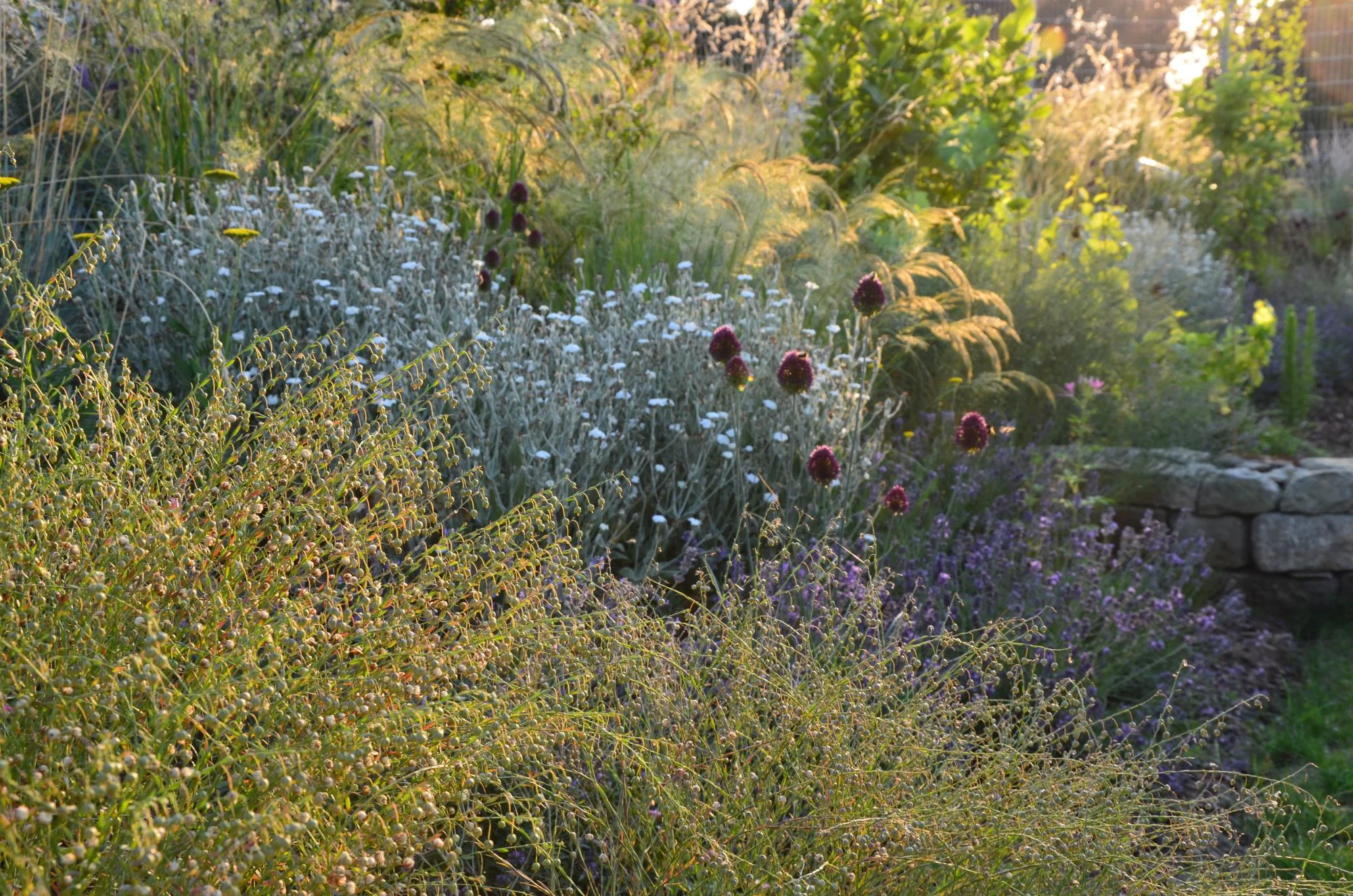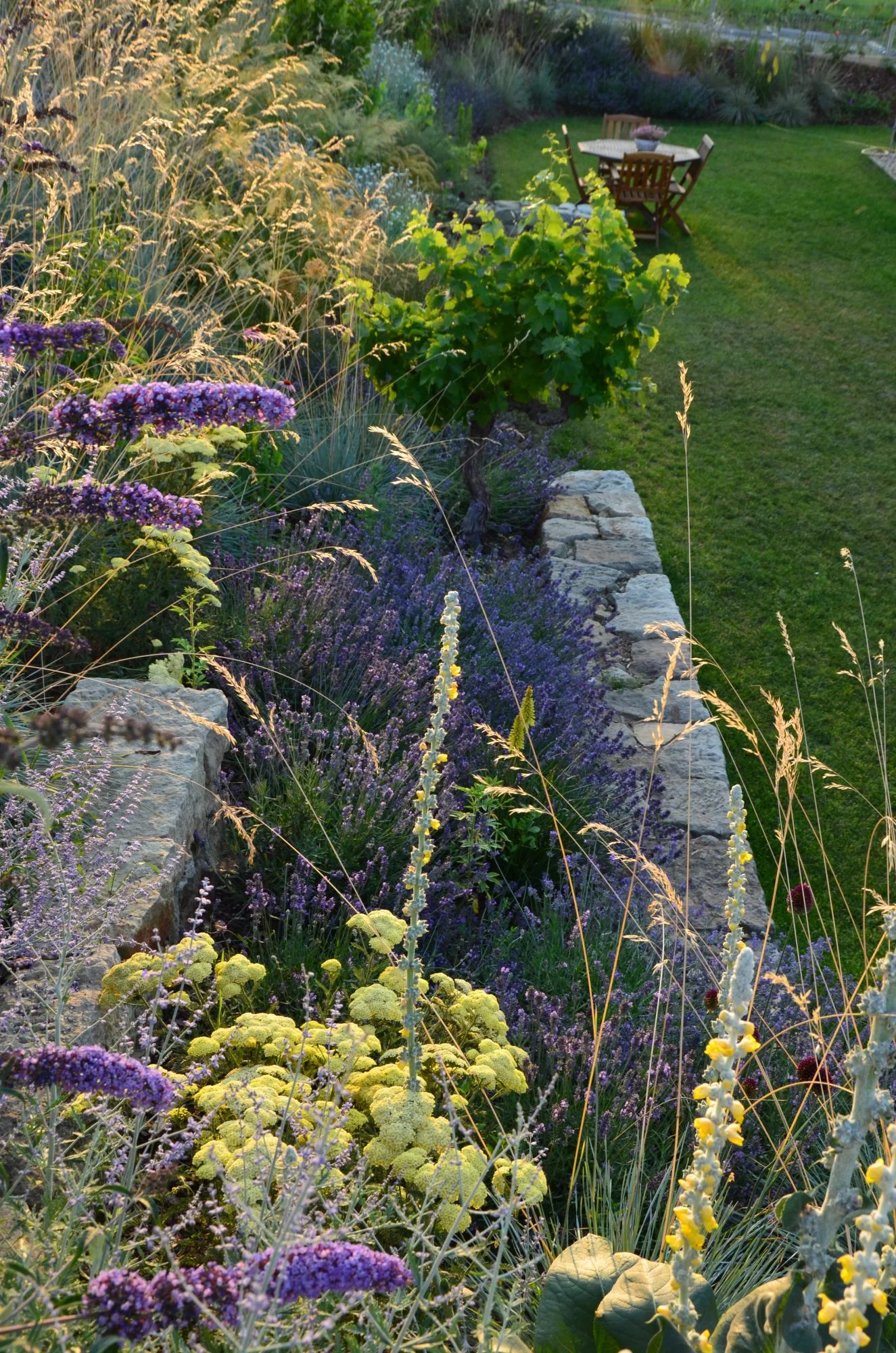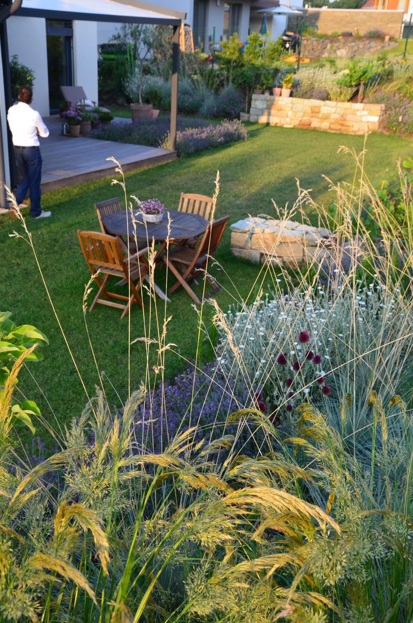 Zkrátka to, co na jižních zemích všichni tolik milujeme. S radostí jsme se nechali unést na jižní vlně a zahradu zaplnili modrou v mnoha odstínech: kvetou zde omamně vonné levandule, perovskie, letní česneky, modré lny, lupiny a komule. Vše doplňuje pohyb lehkých travin, které vlají ve větru a vyvolávají dojem pohybu.