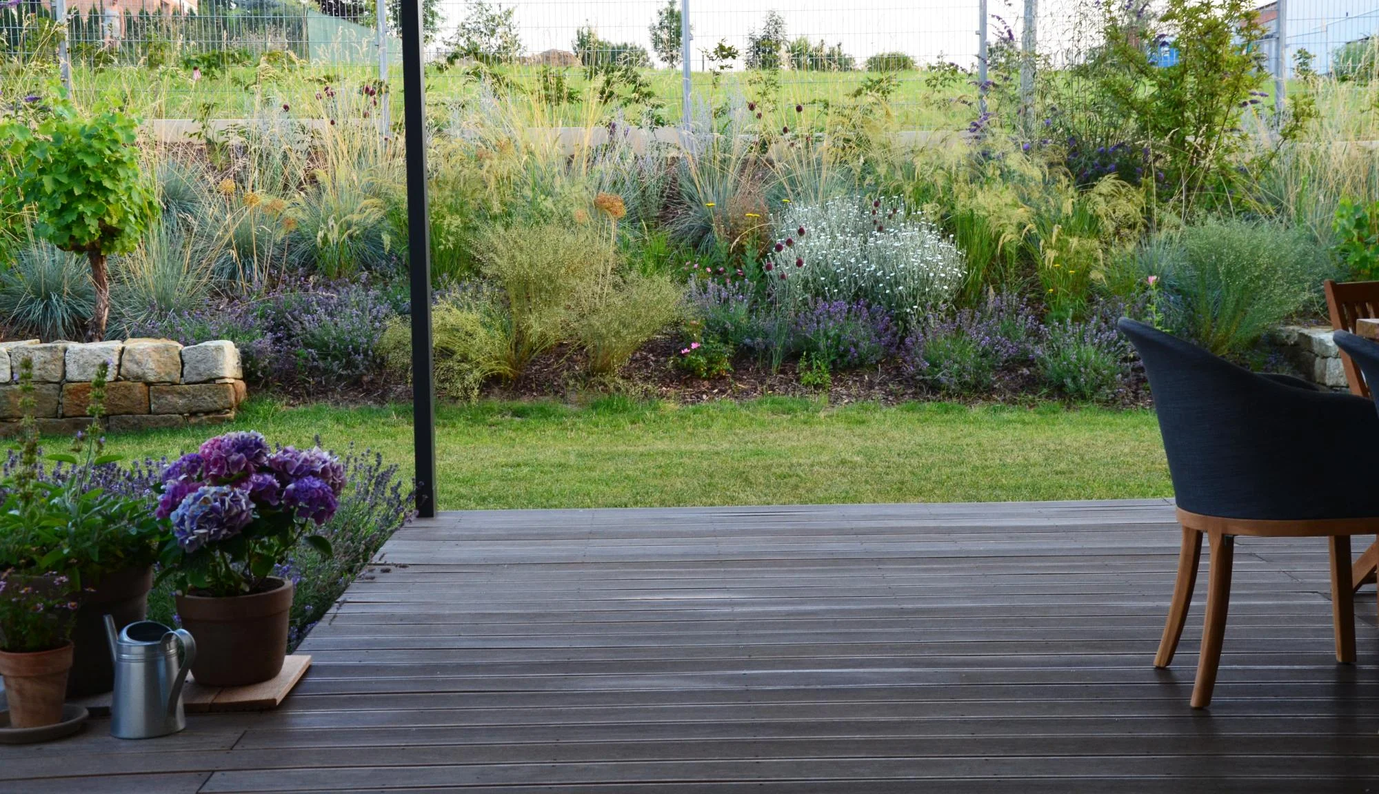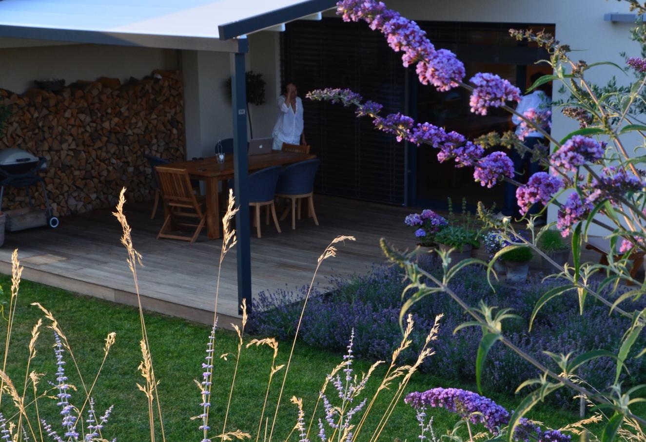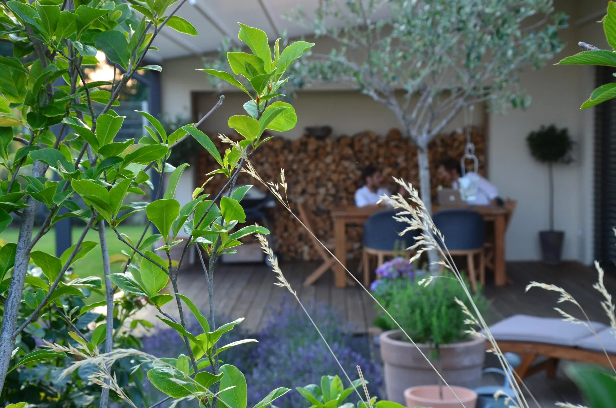 Nádoby s rostlinstvem se přelévají i na hlavní pobytovou terasu, která je zabydlena olivovníky a dalším rostlinstvem - bylinky se tu mísí s letničkami a okrasnými keři. Na dřevěnou terasu navazuje i políčko s levandulí, které tvarově terasu uzavírá. Hlavní sezení je zatepleno zabudovaným dřevníkem, který byl plánován už v projektu domu.