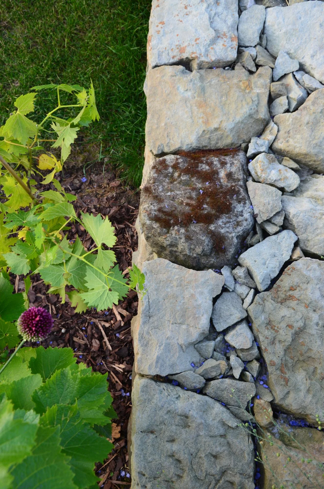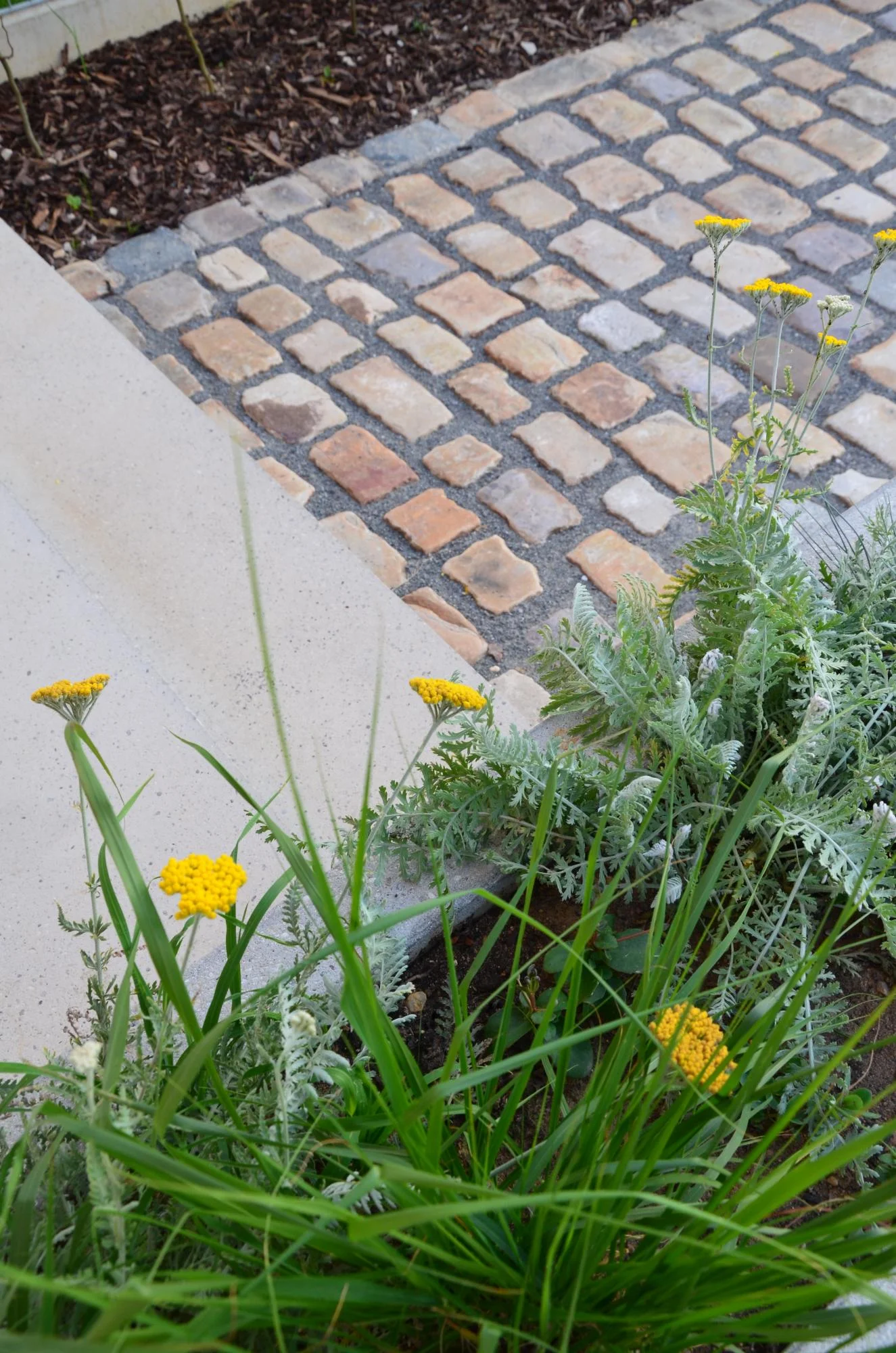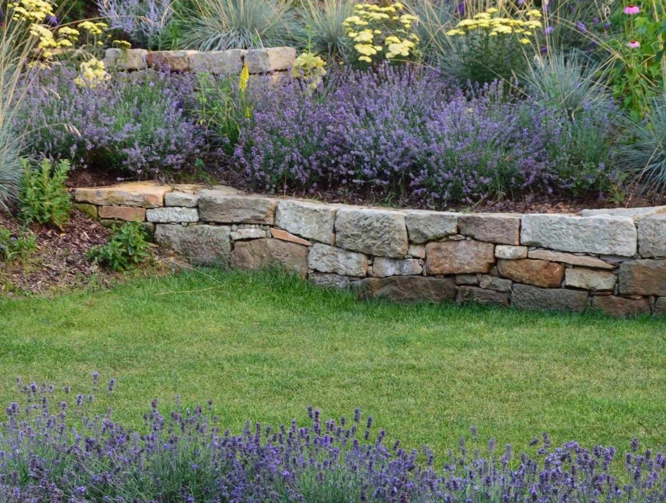 Všechen ten lehký pohyb a jemné tvary jsou pak akcentovány kamennými zídkami, které měly být v původní verzi z vrstveného, probarvovaného betonu v teplých tónech, nakonec jsme ale zvolili tradičnější materiál- skládané kamenné zdi.