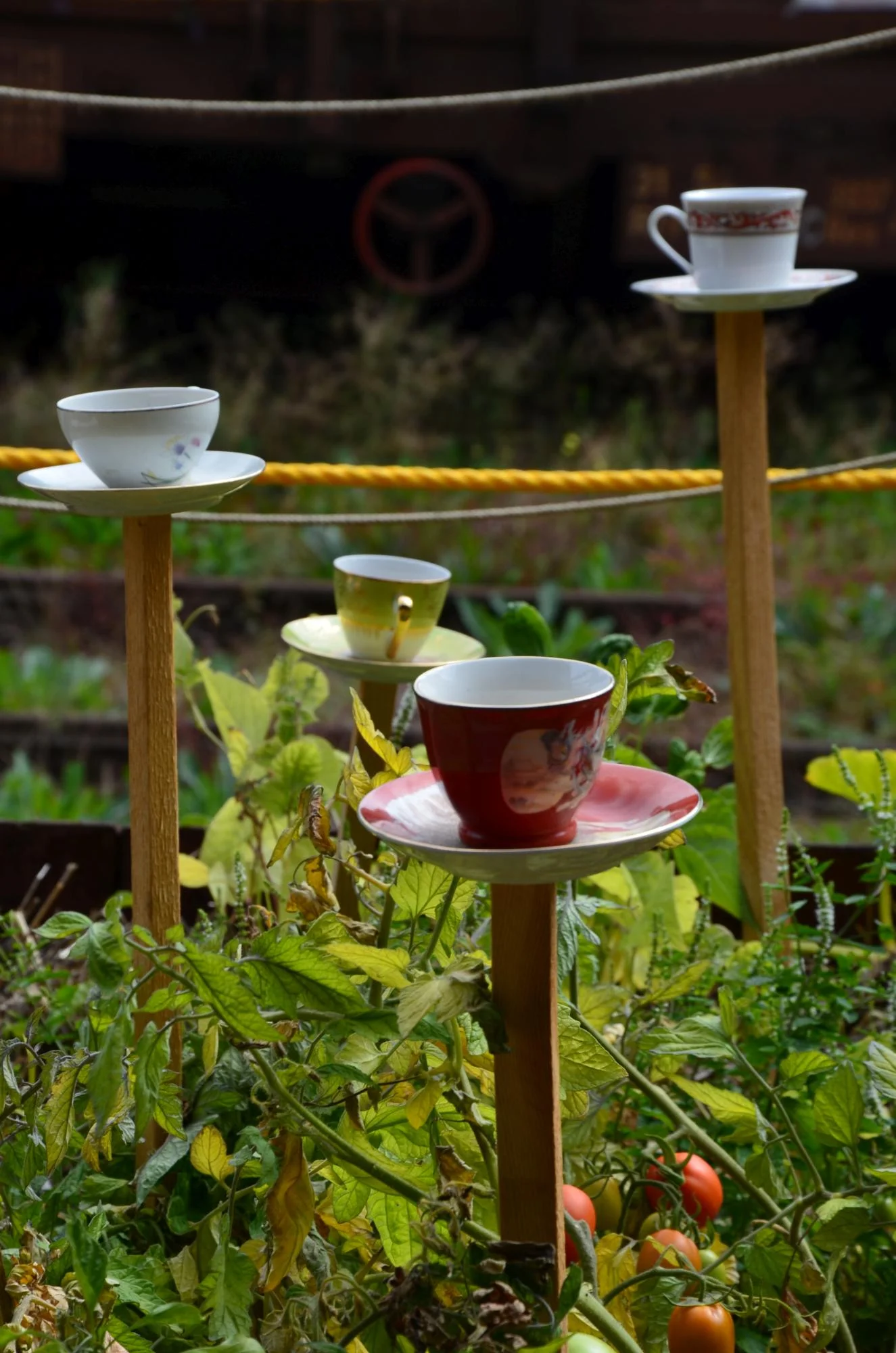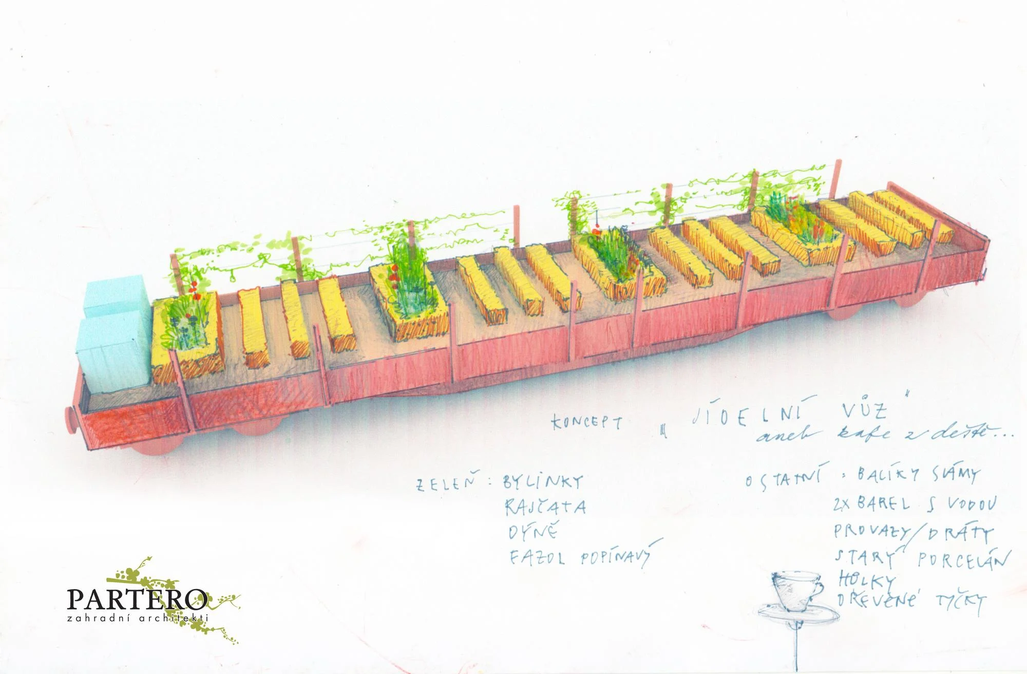 Námi navržený vagon přijel (jak jinak) z Moravy… Stal se jídelním vozem, kde se zcela v souladu s principy raw food podává čerstvá strava pěstována přímo v kupé na záhonech z balíků slámy (straw bale gardening). Čerstvě mletá káva z deště je podávána v tradičních servisech moravských domácností.