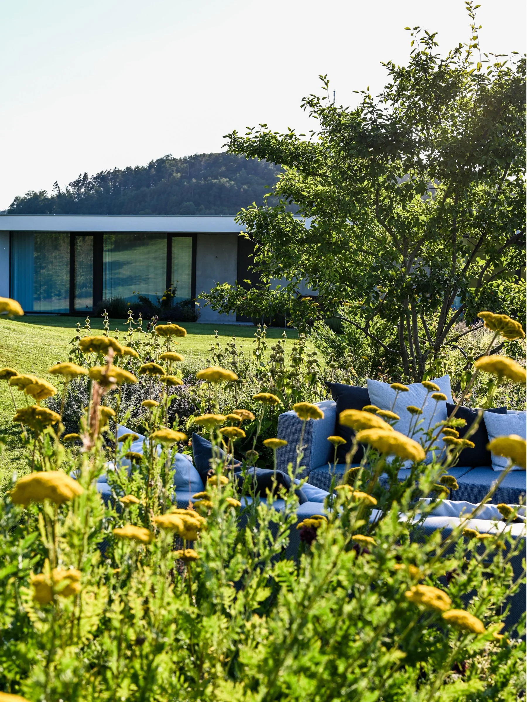 Terasa se natahuje od domu v podobné délce, jako se meze napínají v opačném směru od lesa. Příroda a okrasná zahrada si zde podávají ruku. Velký formát dlažby střídají ostrovy trvalek, tu a tam je zde místo pro ‚vodní mísu‘ nebo grill. Tento barevný záhon funguje jako ‚šev‘ mezi domem, terasou a zahradou.