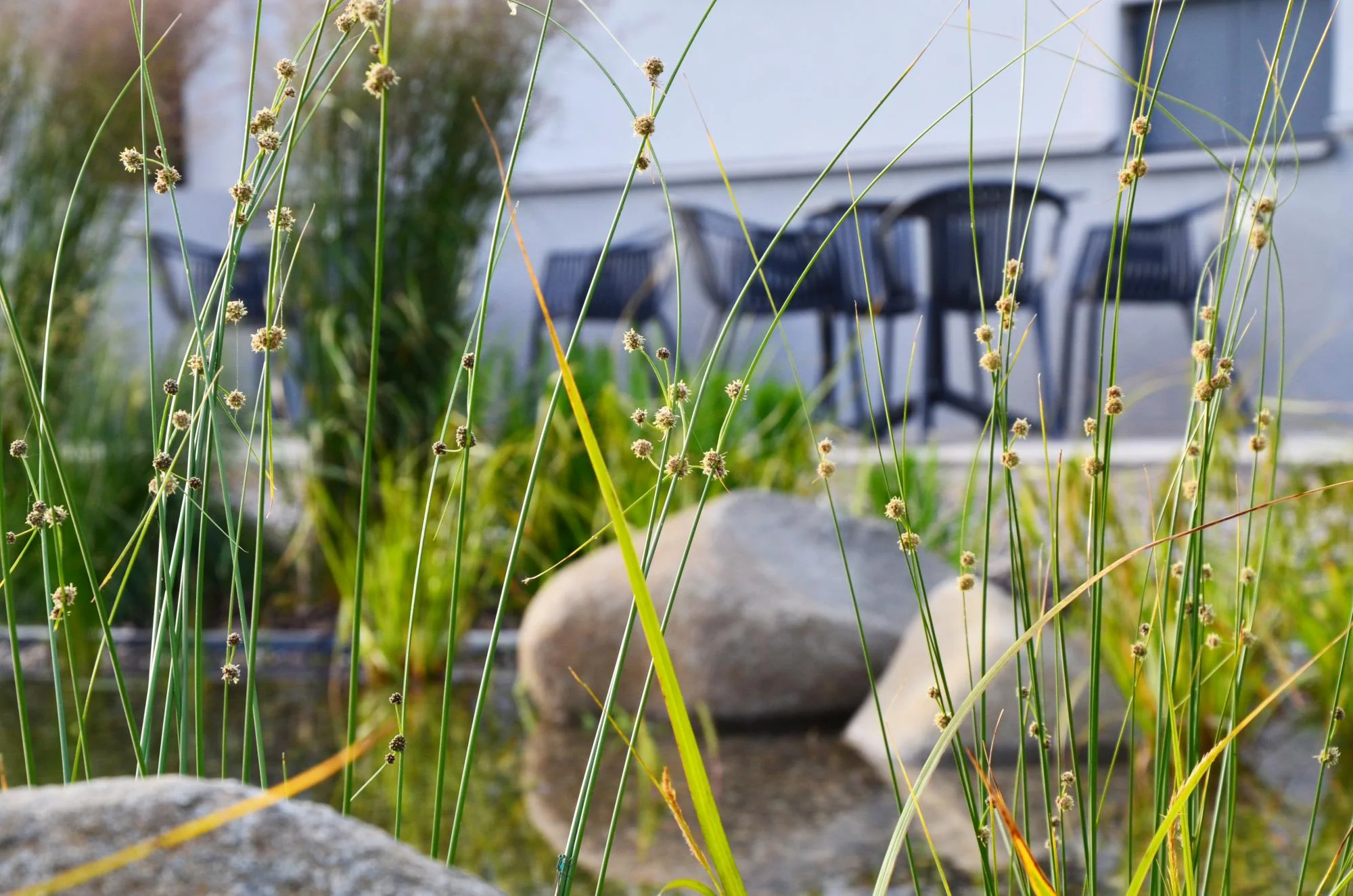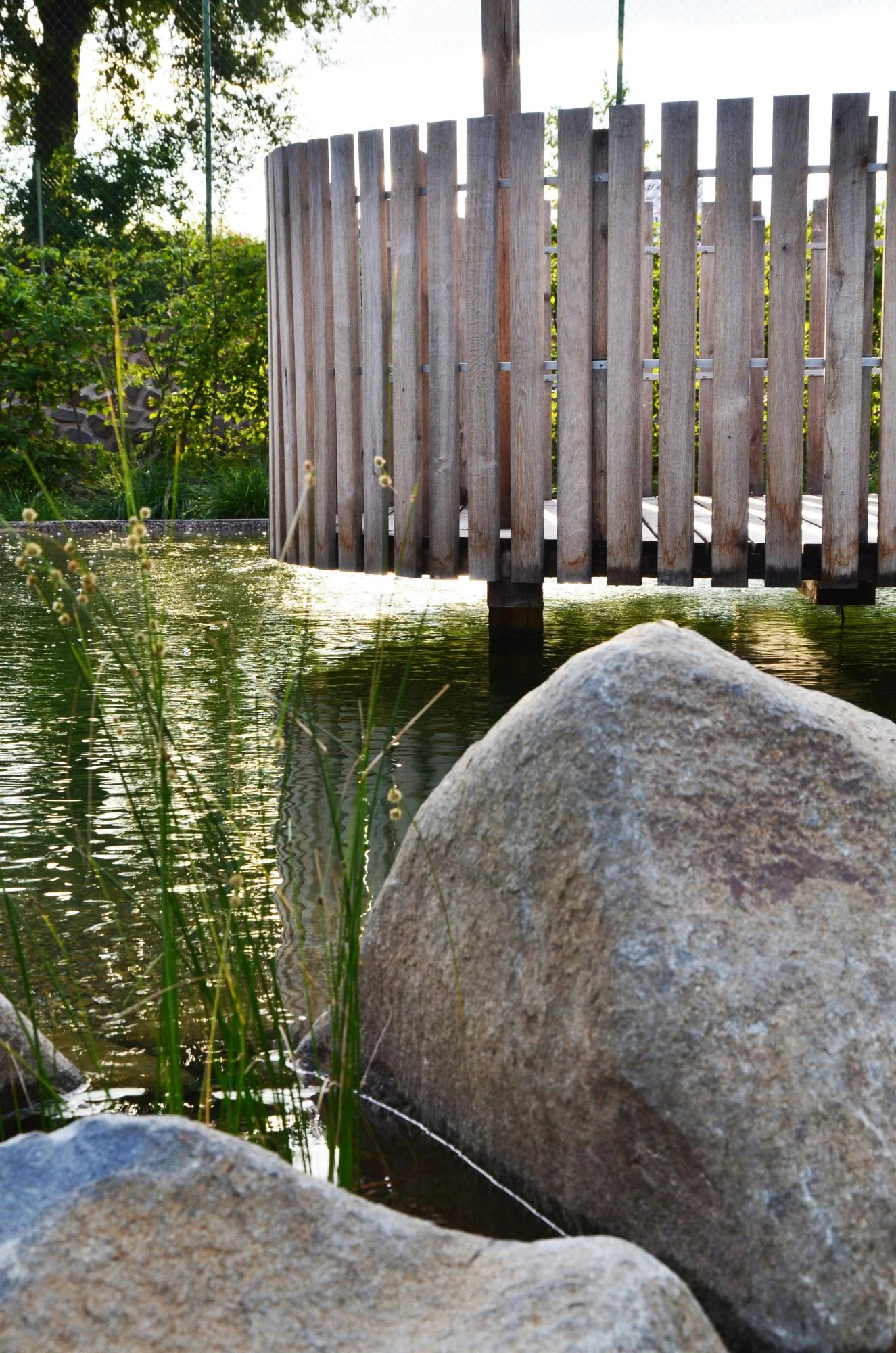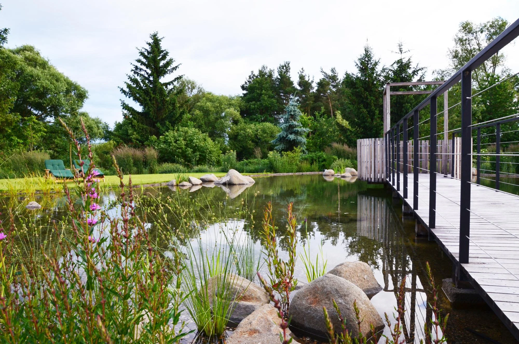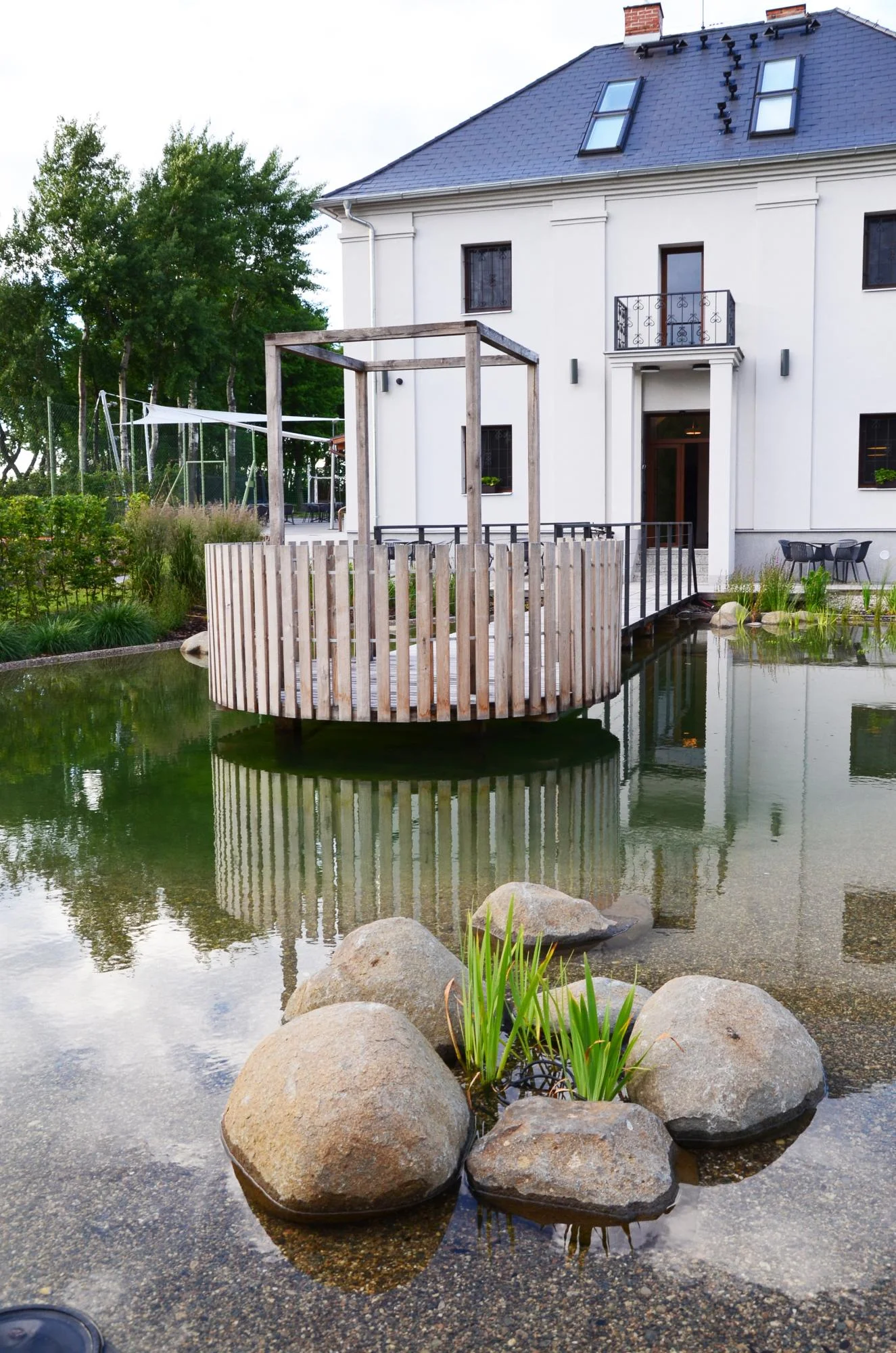 Okolí bylo upraveno záhonovými výsadbami z postupně kvetoucích trvalek a instalacemi z kamenných balvanů, které krásně ladí s vodní hladinou.