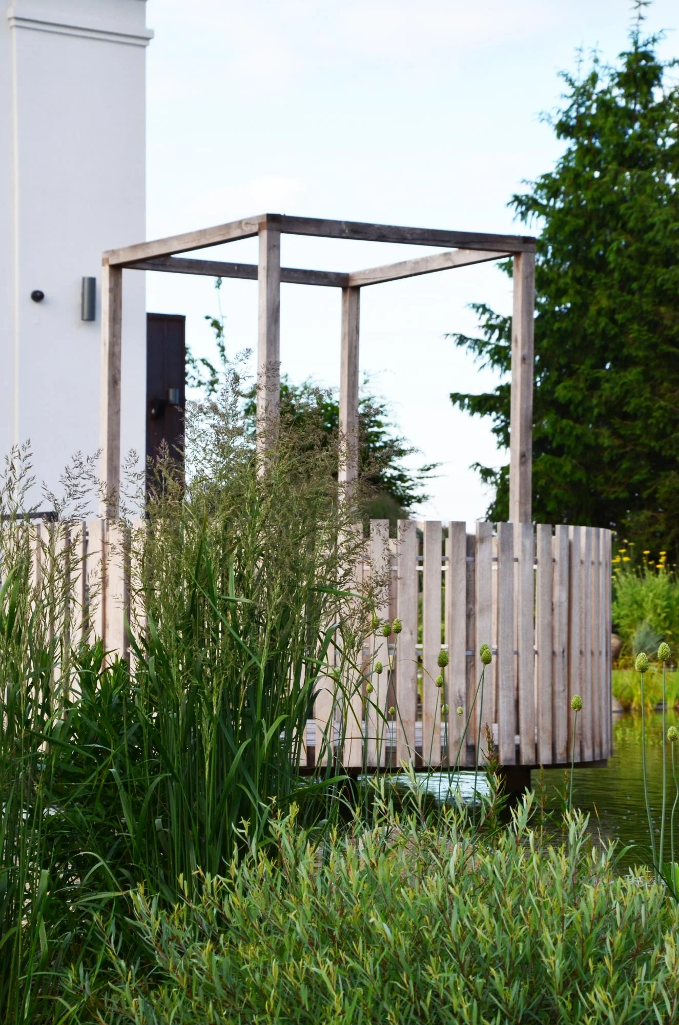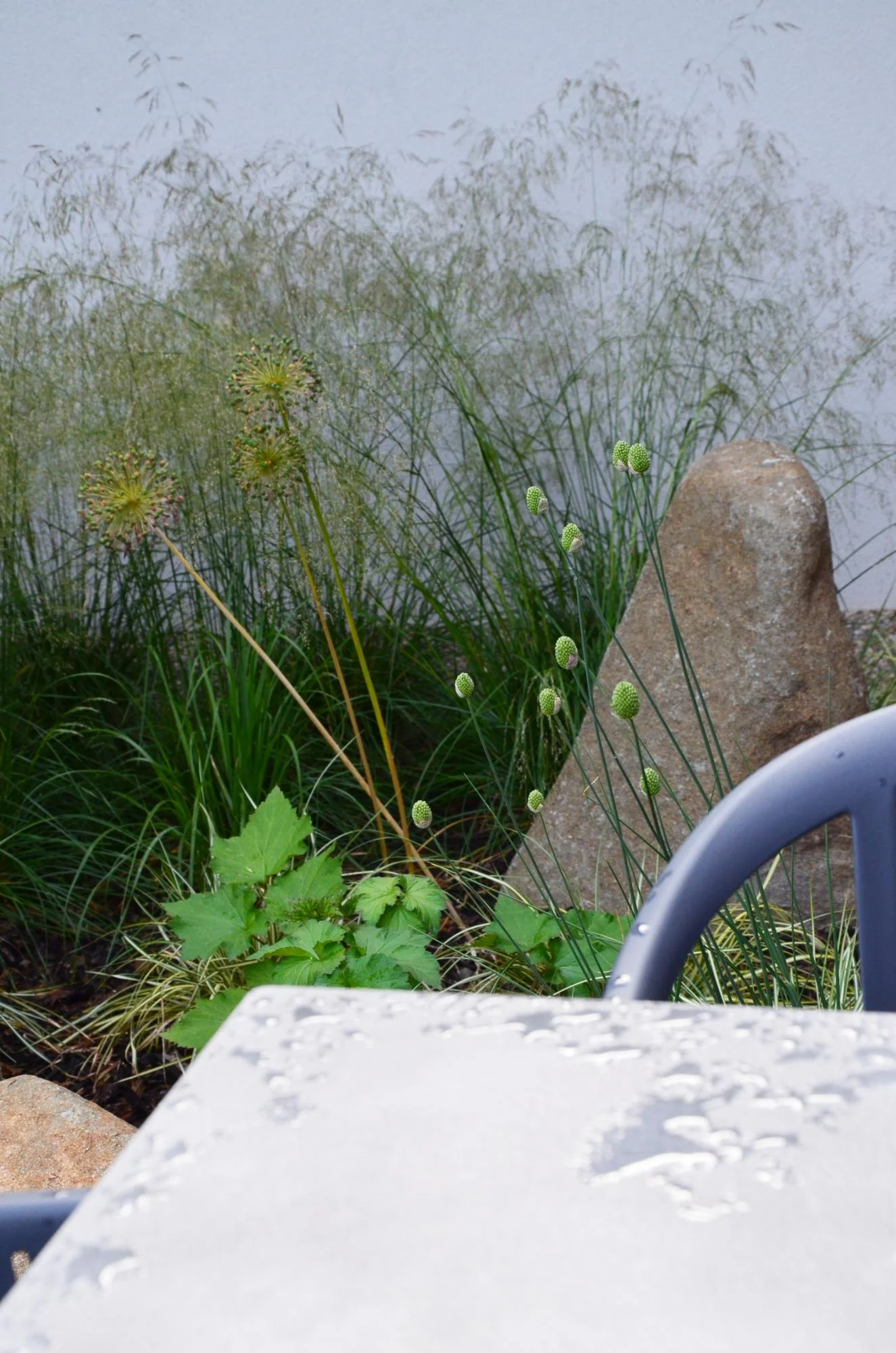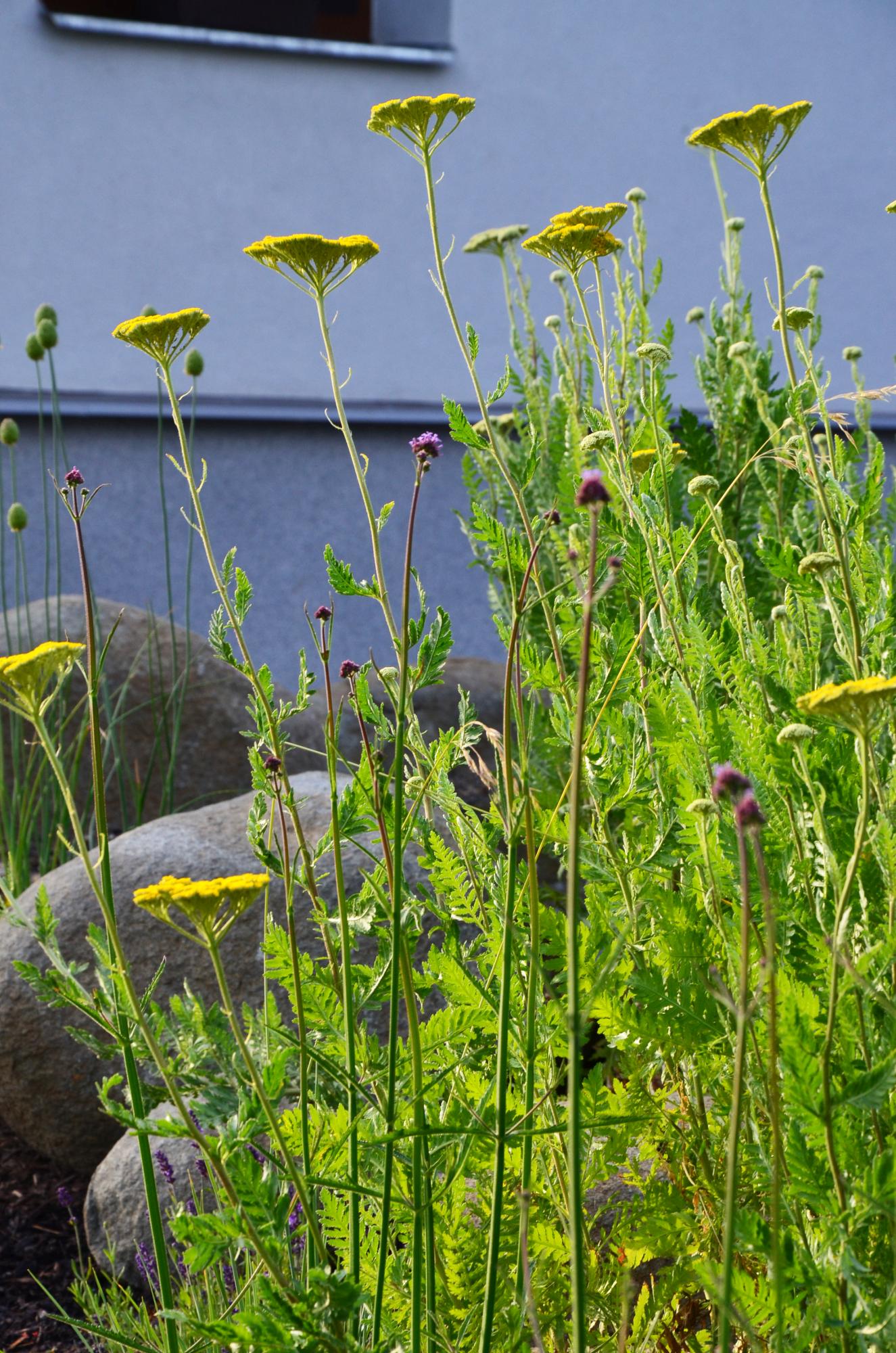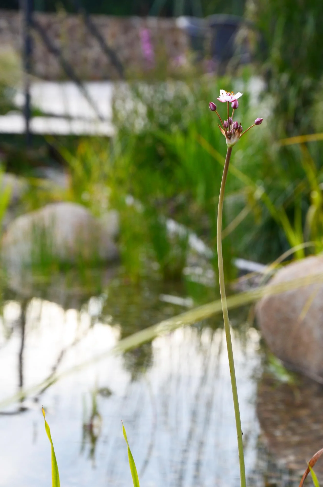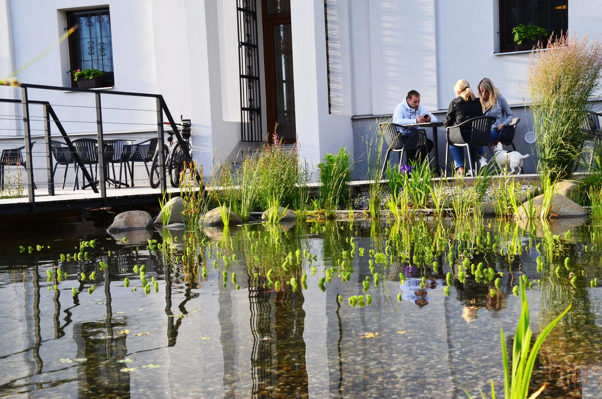 Okolí bylo upraveno záhonovými výsadbami z postupně kvetoucích trvalek a instalacemi z kamenných balvanů, které krásně ladí s vodní hladinou.