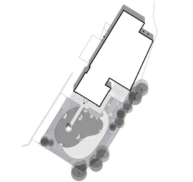 Venkovní úpravy zahrnovaly také návrh vjezdu, parkovacích stání a hlavní dlážděné plochy s novým zastíněním, v úzké spolupráci s autory rekonstrukce budovy.