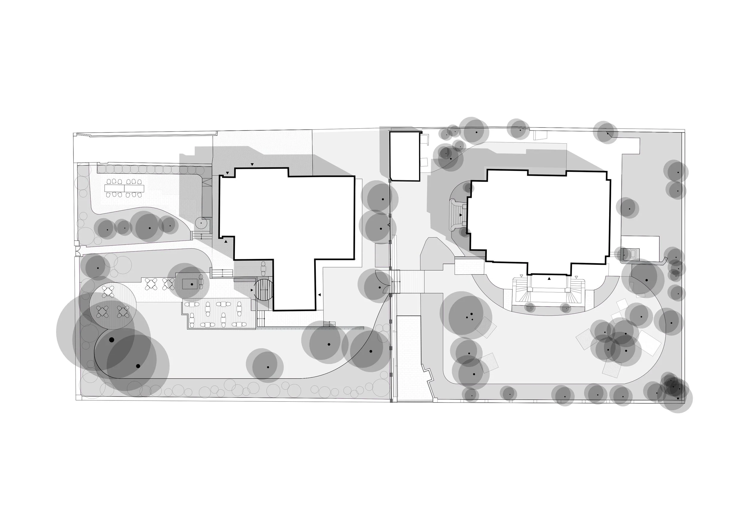 Kompozice zahrady pracuje s otevřeným trávníkem, původní zelení i intimnějšími zákoutími pro posezení. Mobilní nábytek – lavice značky Hey a subtilní stoly Pedrali – podtrhuje lehkost prostoru a umožňuje variabilní uspořádání. Mobiliář je doplněn prvky na míru v podobě sedáků na zídkách nebo dřevěných teras v trávníku pod vzrostlými stromy. Terasa a mobiliář roztroušený v zahradě přirozeně navazuje na interiér a vytváří plynulý přechod mezi domem a exteriérem.