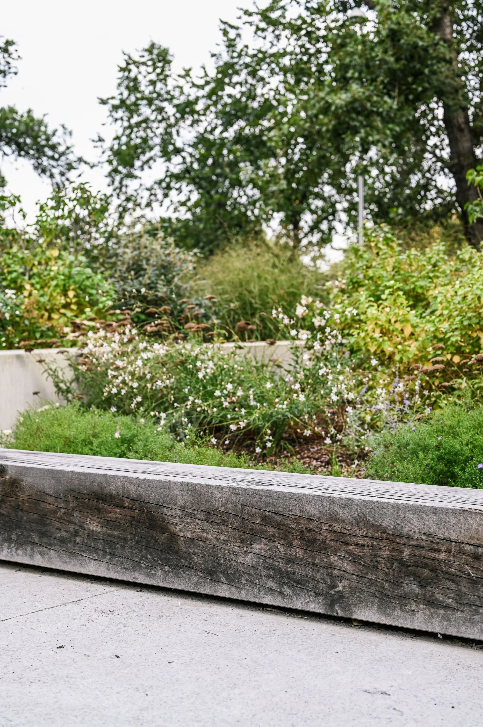 Kapsy jsou lemovány zvýšenými lemy z pohledového betonu, rezivějící oceli a hrubých dřevěných bloků. Dojem ‘tajných’ posezení v útulné náruči zeleně umocňuje terénní val na straně nábřeží. Terénní modelace je osázena dřevinami a odděluje lineární park od rušné cyklostezky, která vede mezi office komplexem a Vltavou.