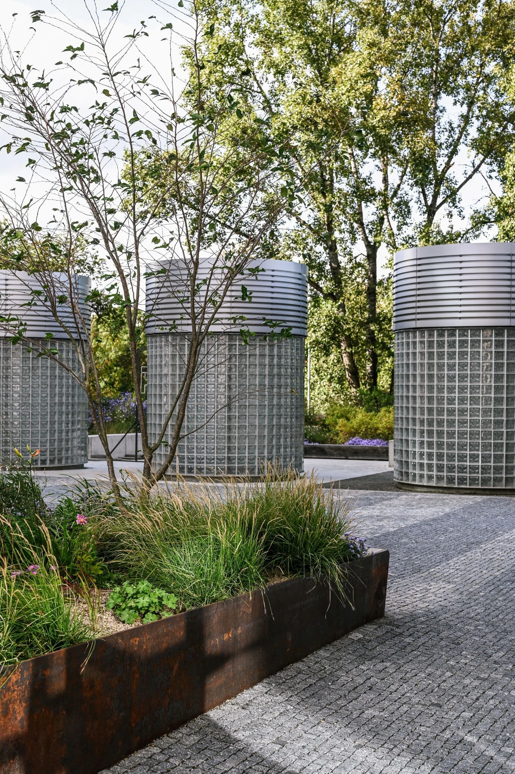 Z technických objektů větracích výdechů z garáže se díky citlivému řešení z luxferů stal estetický, téměř sochařský objekt uprostřed parku.