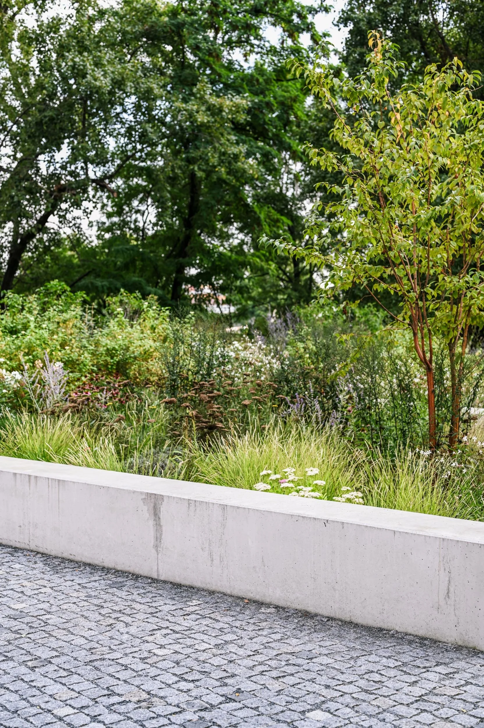 Dlažbu ze štípané žulové kostky střídají plochy mlatu, betonu a dřevěné terasy. Každý si tak přijde na své a může si najít přesně takové místo, na jaké se zrovna cítí. Malý, uzavřený, nebo naopak velký a přístupnější.