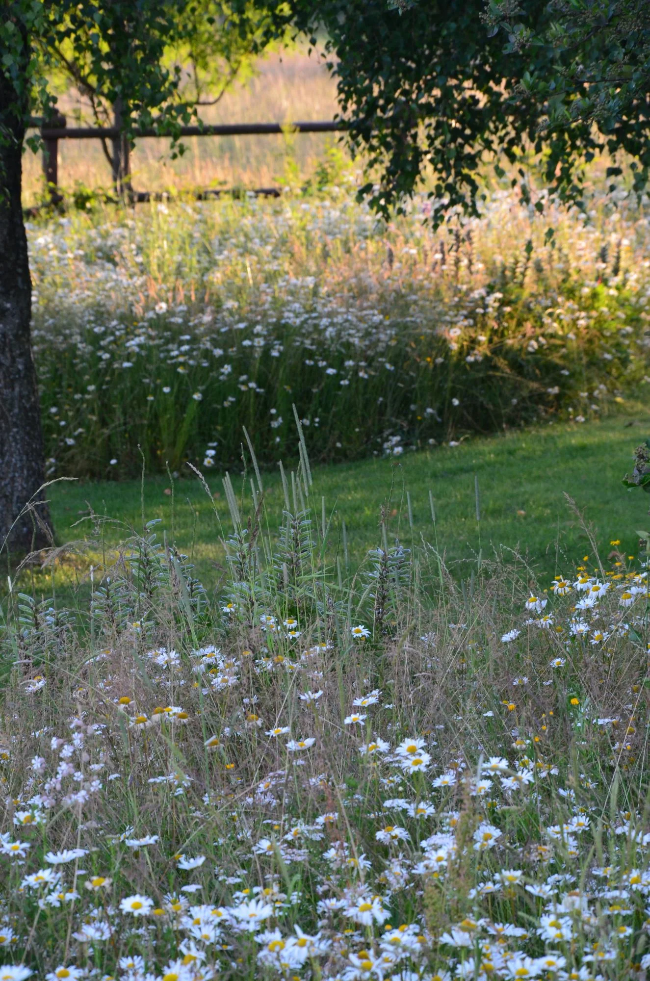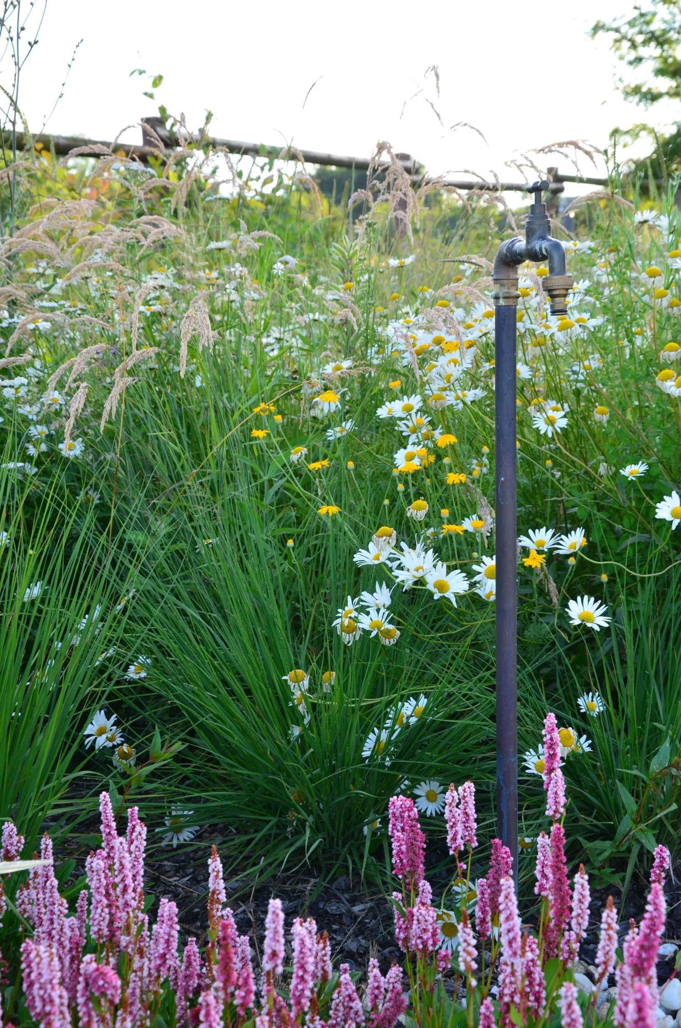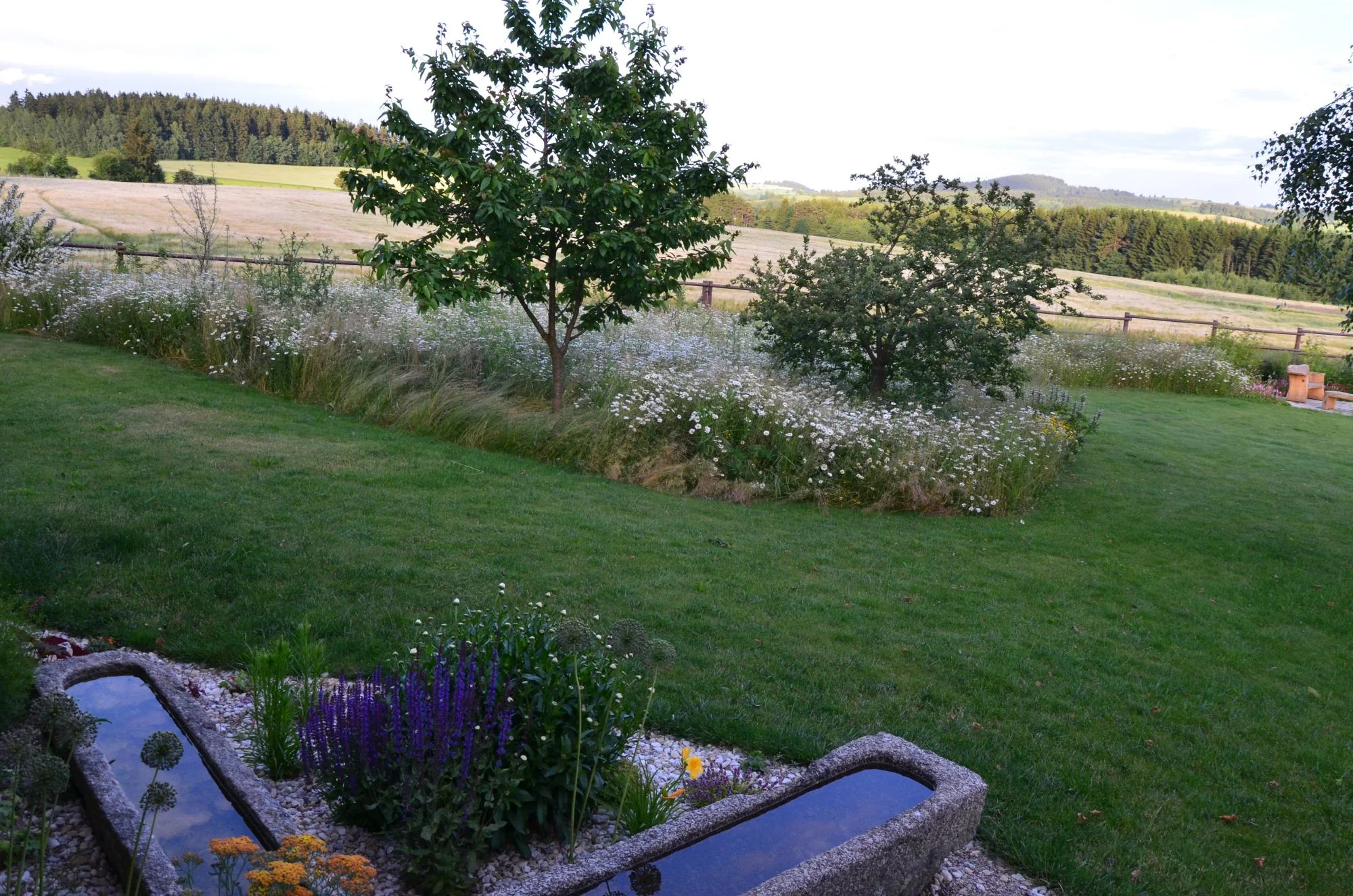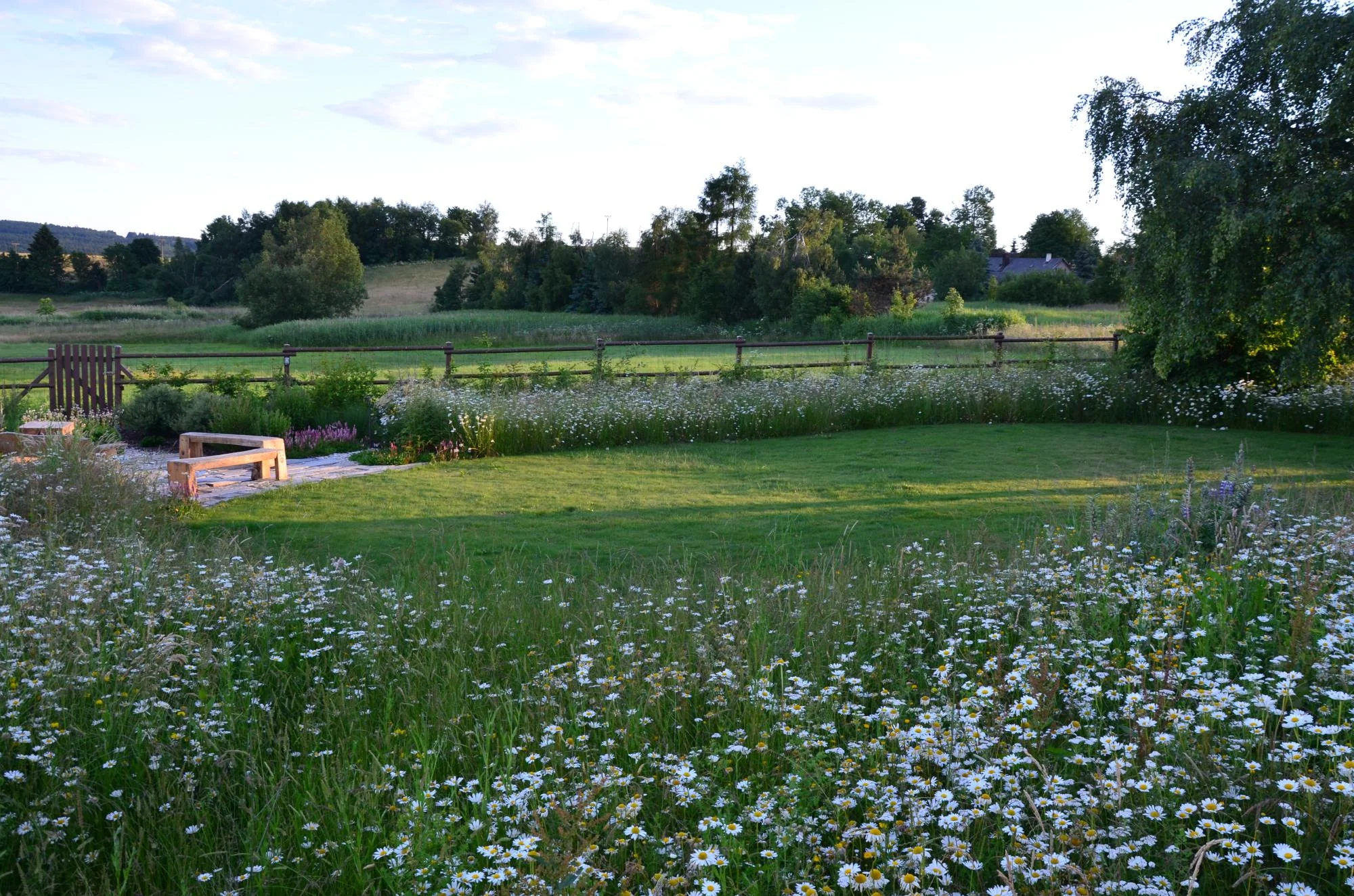 Pojítkem těchto tří míst a vlastně celé zahrady se stala luční výsadba, která zahradu změkčuje a propojuje. Luční modelace jsou plné kopretin, které zde byly vysety na přání paní majitelky.