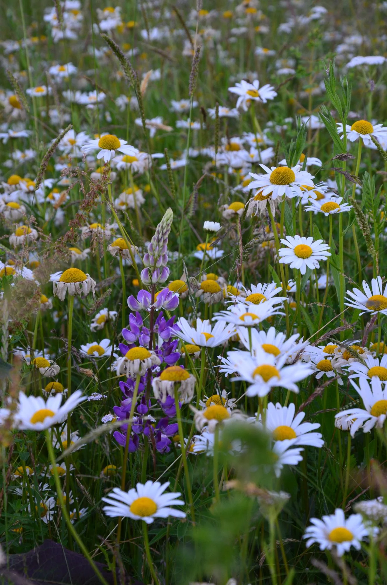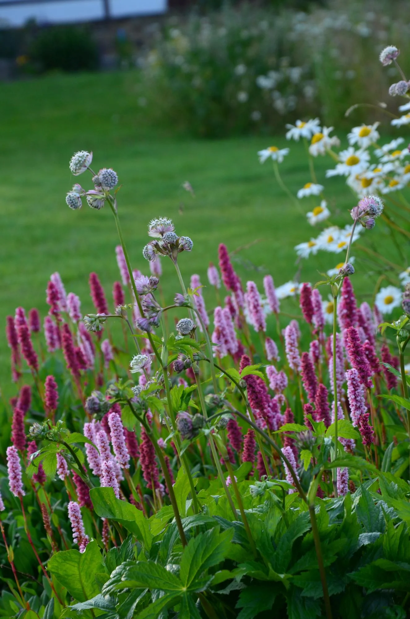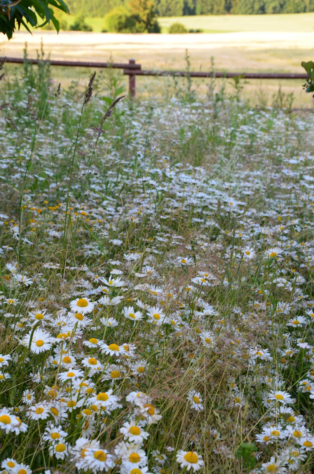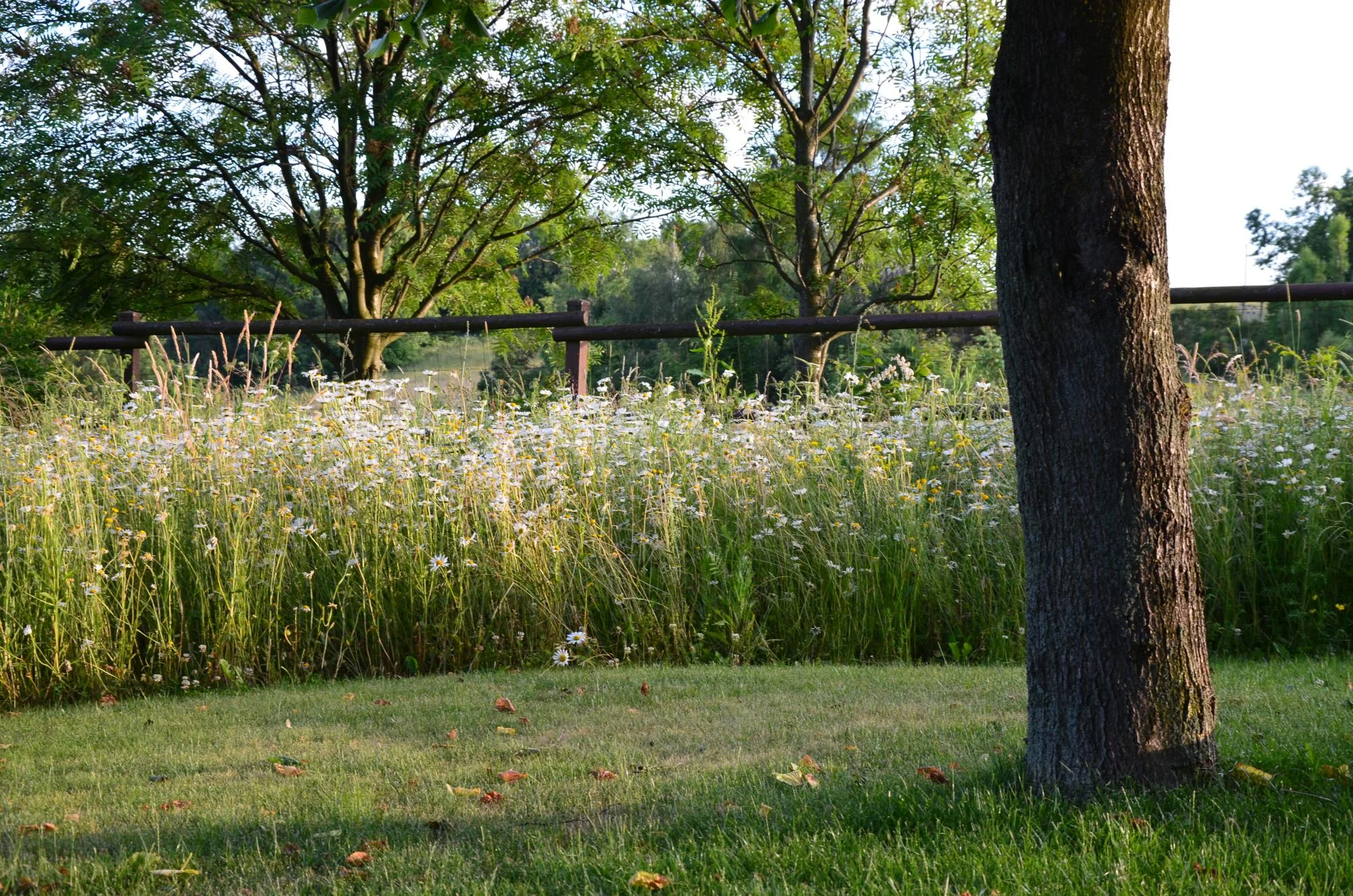 Pojítkem těchto tří míst a vlastně celé zahrady se stala luční výsadba, která zahradu změkčuje a propojuje. Luční modelace jsou plné kopretin, které zde byly vysety na přání paní majitelky.