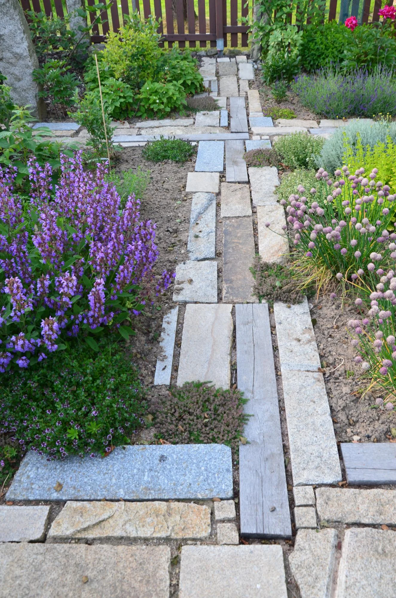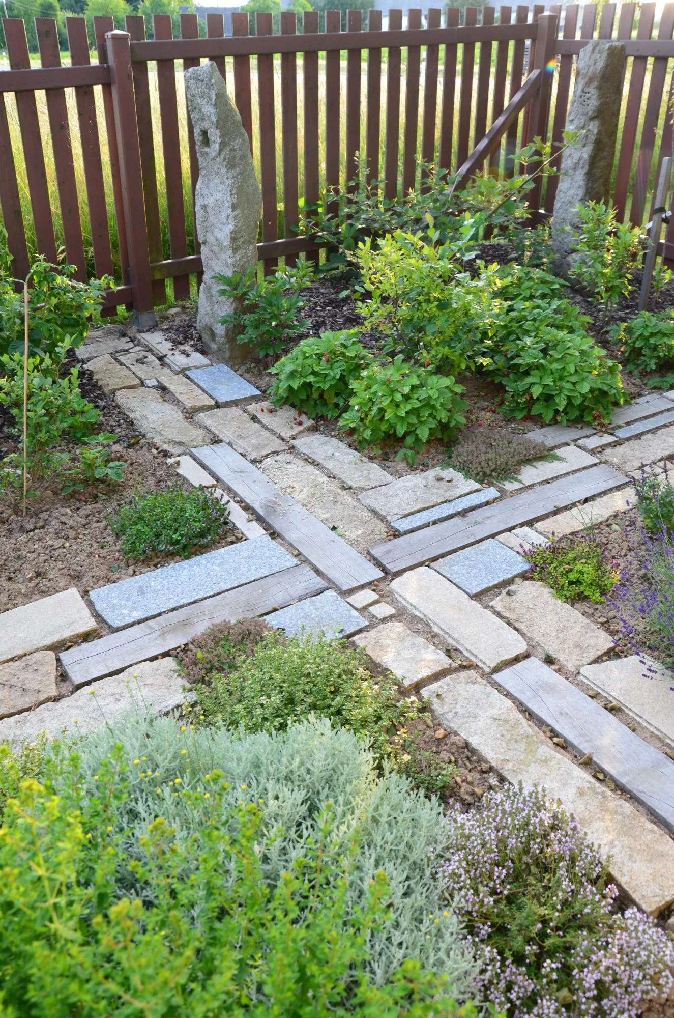 Bylinková zahrada je jednoduše rozdělena praktickou cestičkou, která je mozaikou z dřevěno – kamenných dílů a materiálově navazuje na kamenná koryta u terasy. Ty jsou v sezóně naplněny vodou, ve které se zrcadlí nebe a také květy okolní trvalkové zahrádky.