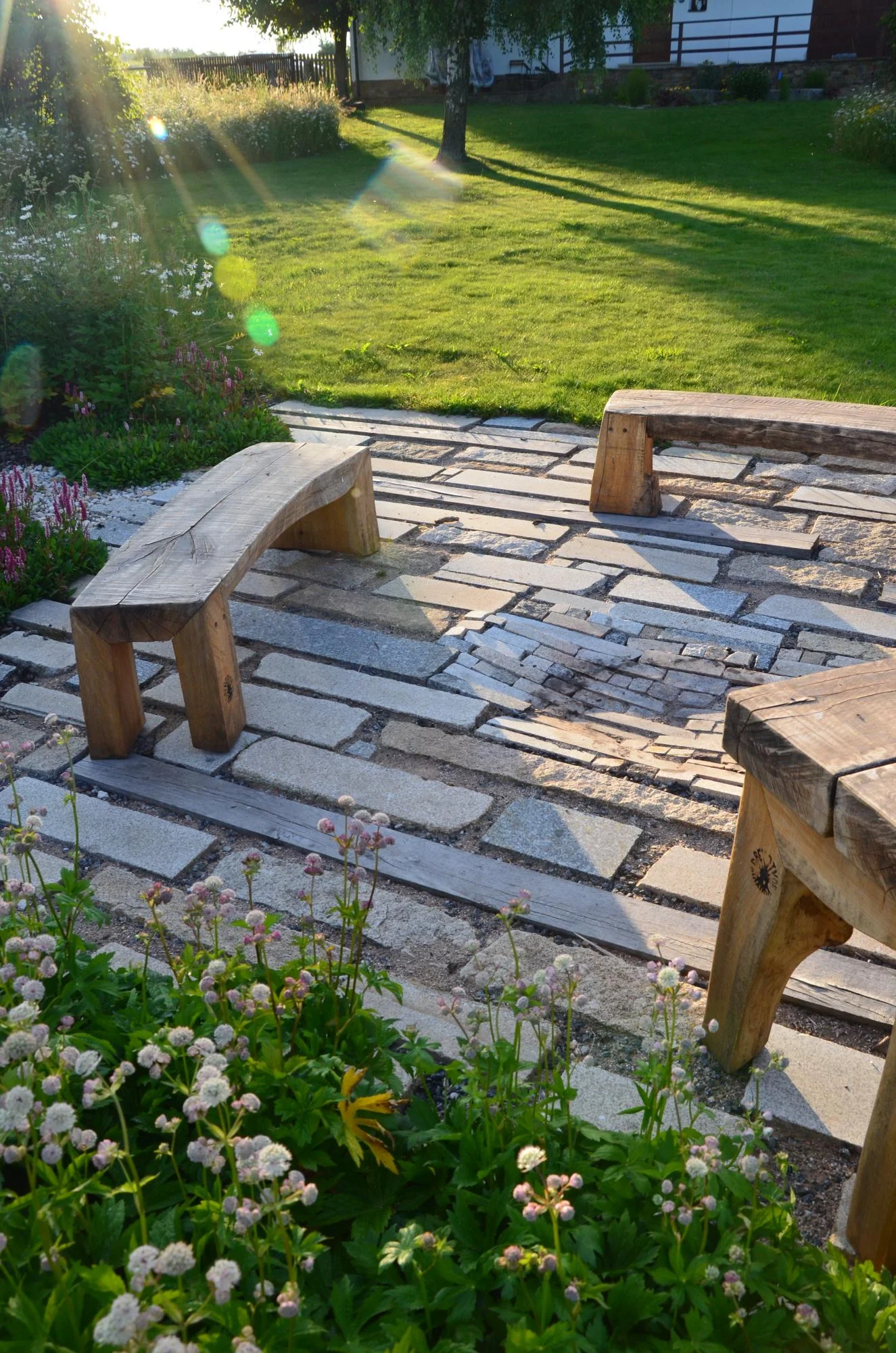 Její původní obsahová náplň byla nezajímavou směsí keřů a trávníku. Z naší strany nedošlo k nijak fatálním zásahům. Tentokrát nebylo potřeba nic překopávat, pouze se dotvářelo, přemisťovalo, ale také nemálo vyhazovalo a rozdávalo. Obsahově jsme zahradu obohatili o tři hlavní funkční místa, s ryze praktickým posláním.