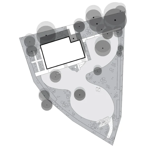 Zahrada má tvar lehce zakřiveného trojúhelníku, který je jako střelka kompasu namířen do krajiny.