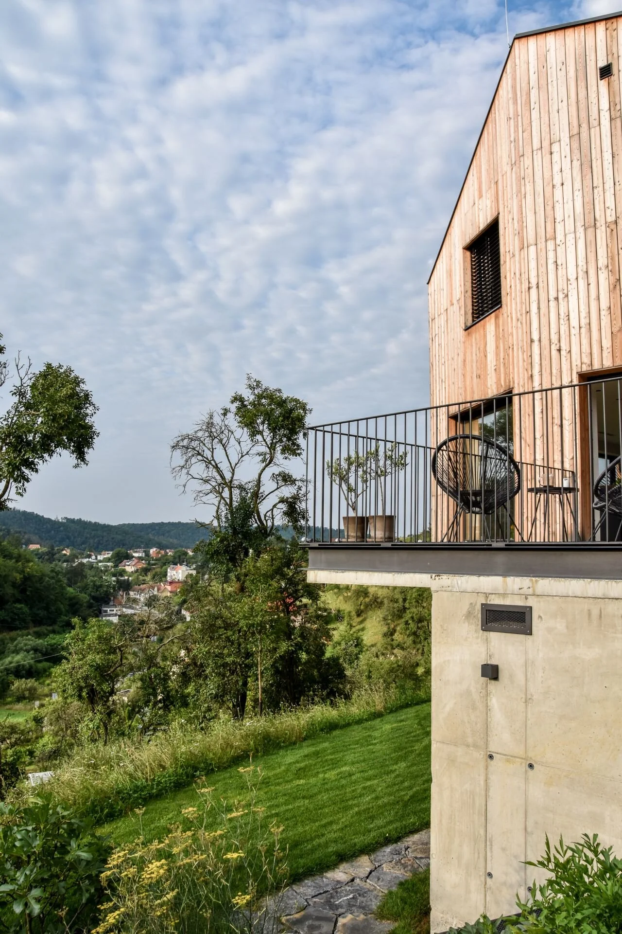 Na sedmi ocelových sloupech se nad svahem skví drobná prizmatická hmota dřevem obloženého domu. Díky citlivému vsazení do terénu užívá vyhlídky do údolí, přičemž při pohledu z ulice nijak nevyčnívá.